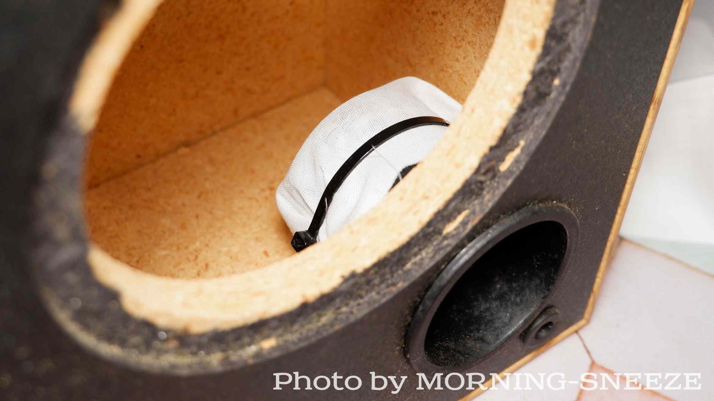 フロントバスレフのダクト内に、埃のように細かくなったグラスウールが付着しているのが気になった。空気の流れで内部から少しずつ吐き出してくるようなので、対策を施す。