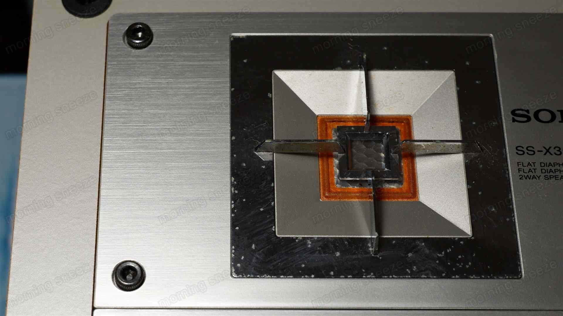 ウーファー部は、振動板に合わせて四角くくり抜かれている。ツイーターのほうは四角くないけど、結線用の二つの平形端子のタブが干渉しないよう、鈴のような形をしている。