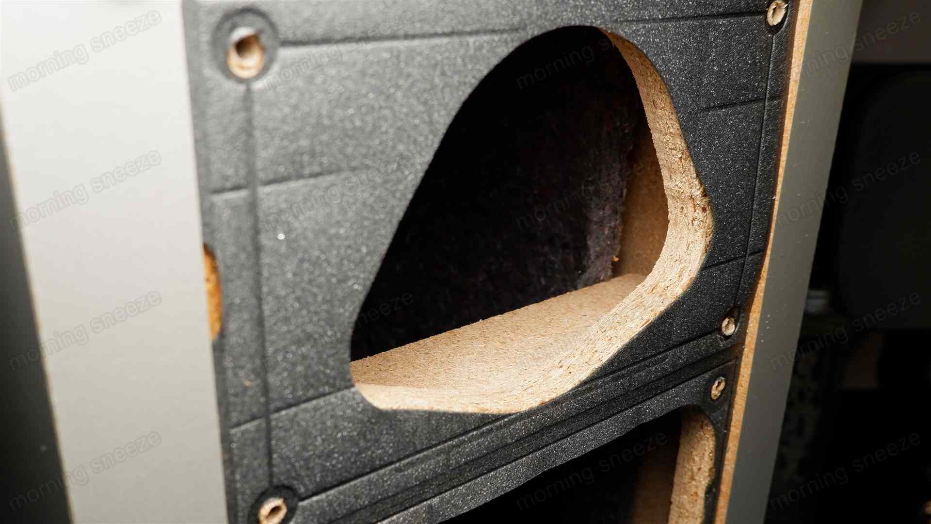 このパーティクルボードの端材は側面では固定されておらず、あくまでもバッフル部の削れて脆弱になった部分を補強する目的で設けられているようだ。