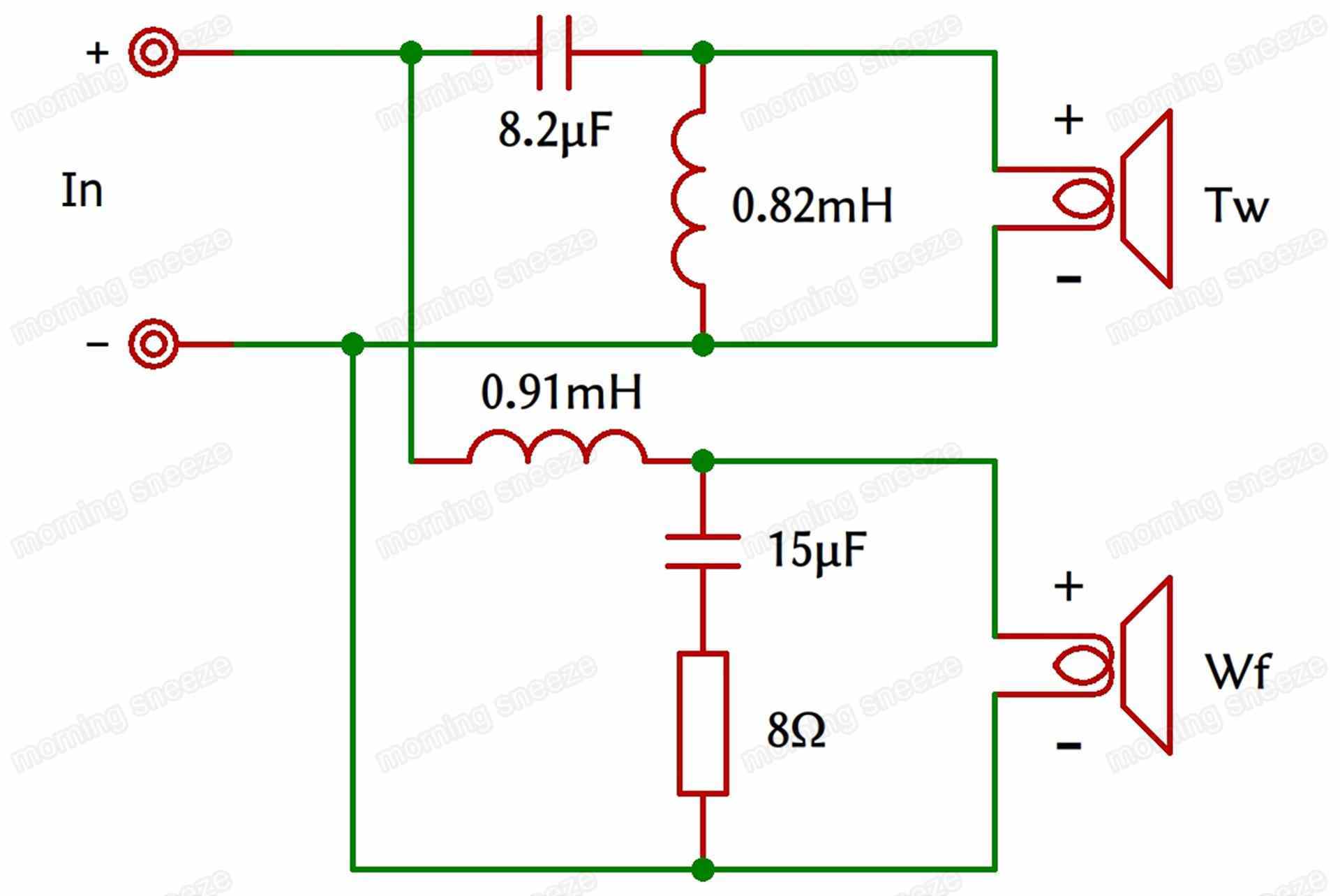 ツイーター回路のコンデンサーとコイルが大きめで、再生周波数の受け持ちが広い。クロスオーバー周波数が低めとなっている。