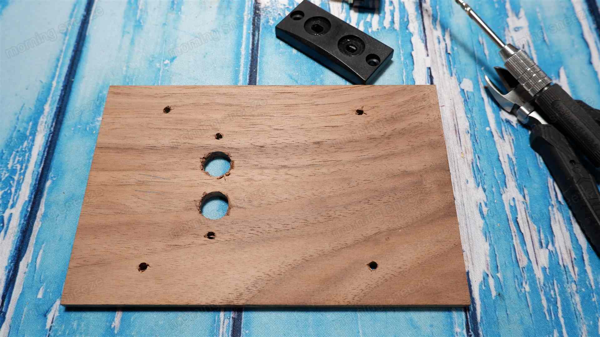 MDFもウォールナットと同様、ネジ固定用の四つの孔を開ける。
