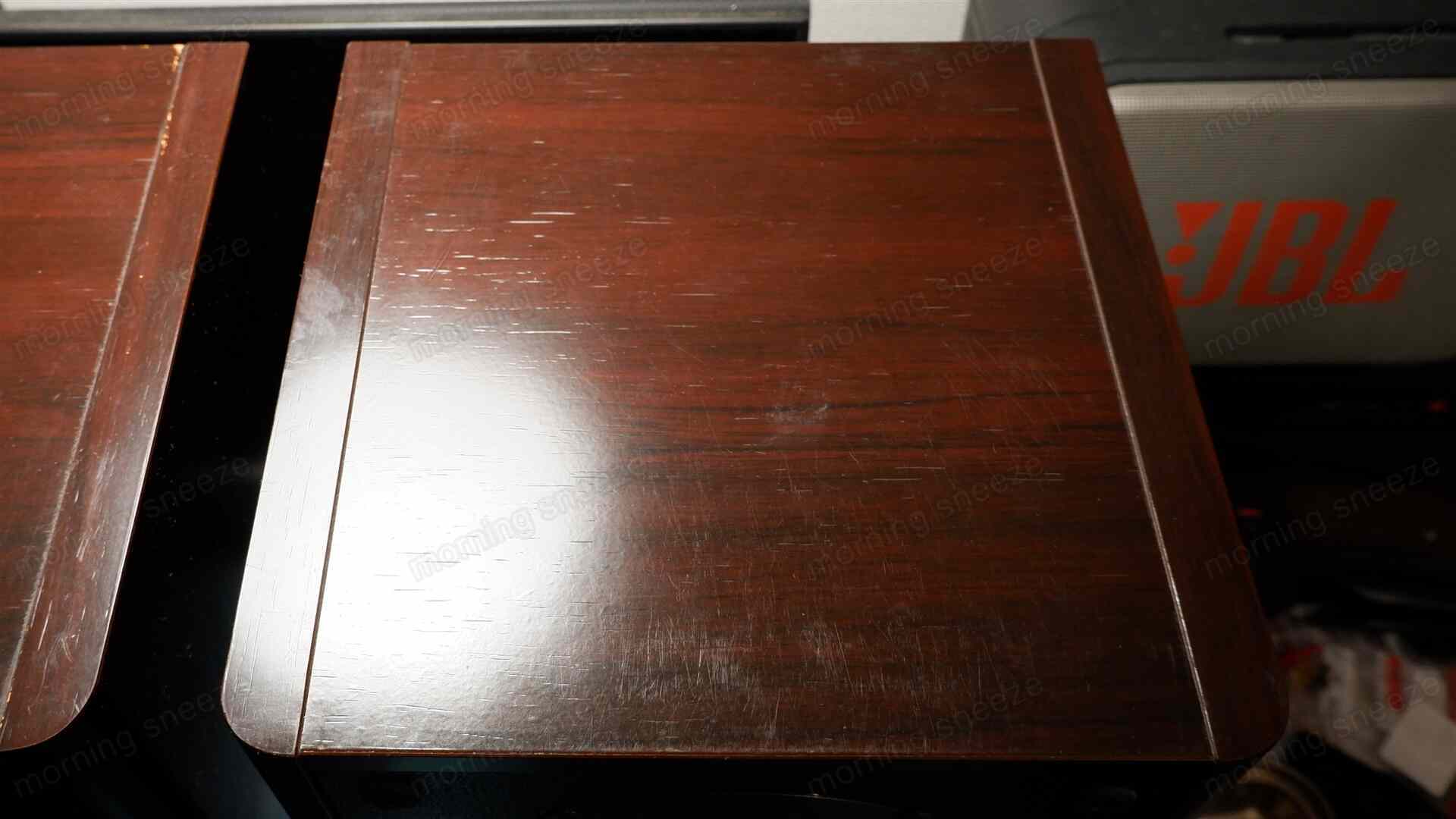 本機のエンクロージャーは前面の左右にRが付けられており、その加工がパーティクルボードでは難しいために側面の板材のみMDFが採用されていると推測する。