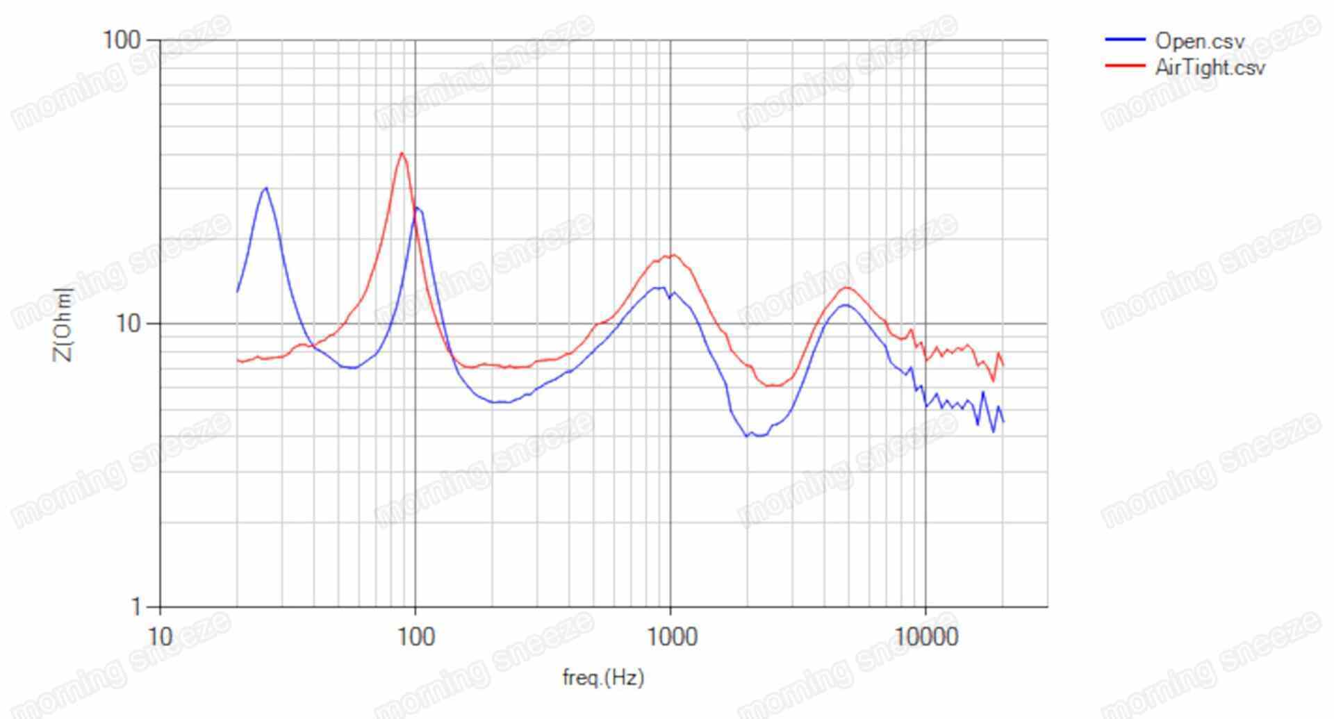 いっぽう、なにげなくインピーダンス特性を計測してみたら、バスレフポートの解放時と閉塞時で異なる結果となった。100Hz以上の音域で、大きいところでは2Ωほどの差が見られる。