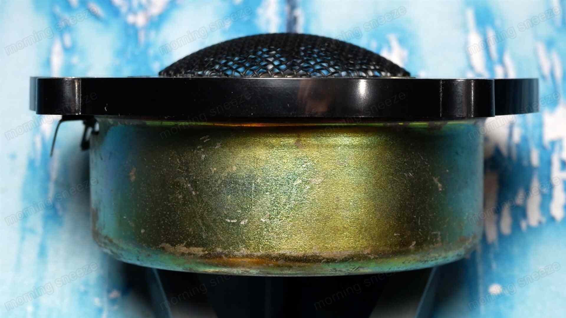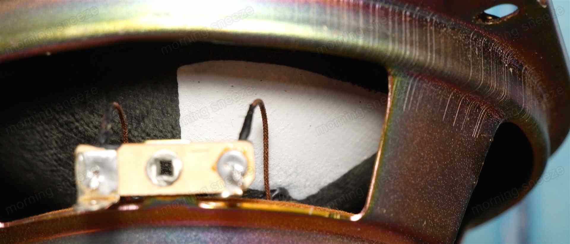ダンパーが柔らかめなのか、表面を指で押すとかなり深く沈む。エッジ自体が柔いのもあって、内部のボイスコイルが割と簡単にマグネットに接触する。