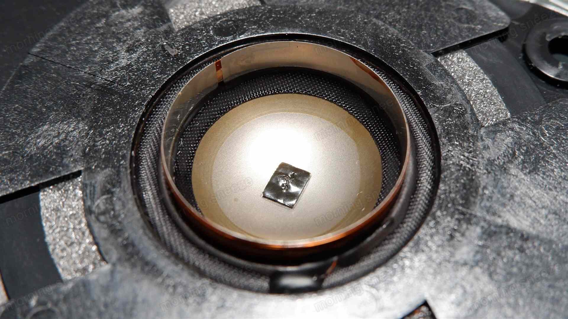 ドームの内側にも細工が施されており、中心部に薄いゴムシートの切れ端のようなものが接着されている。さらに外周部にはファブリックテープのようなものがグルリと一周貼られている。