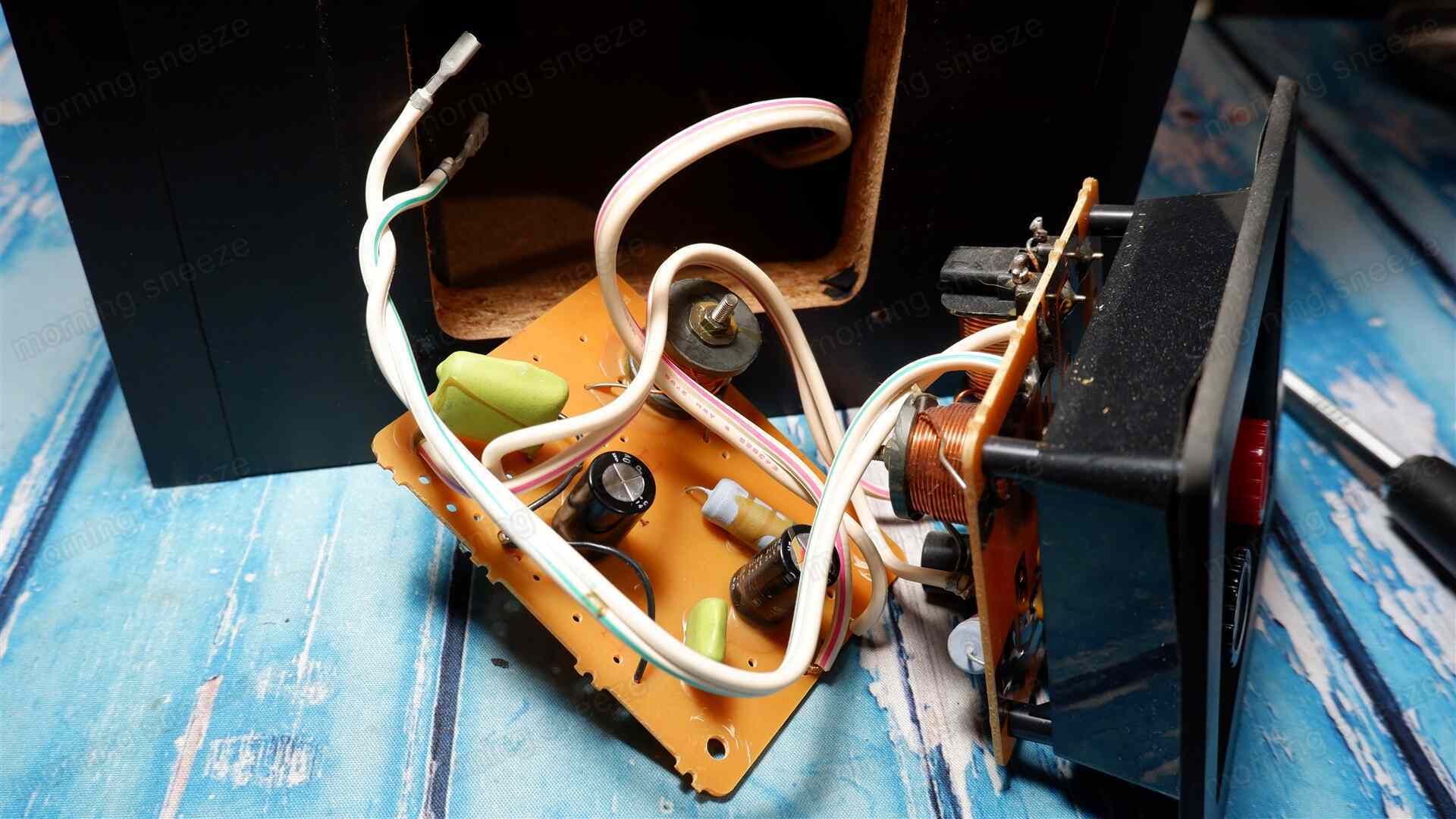 弄らないといっても、30年経過しているであろうコンデンサーは新しいものに交換する。そのさい、ツイーターのHPF用の一段目と三段目を入れ替え、併せて一段目を電解コンデンサーからフィルムコンデンサーに変更してみる。