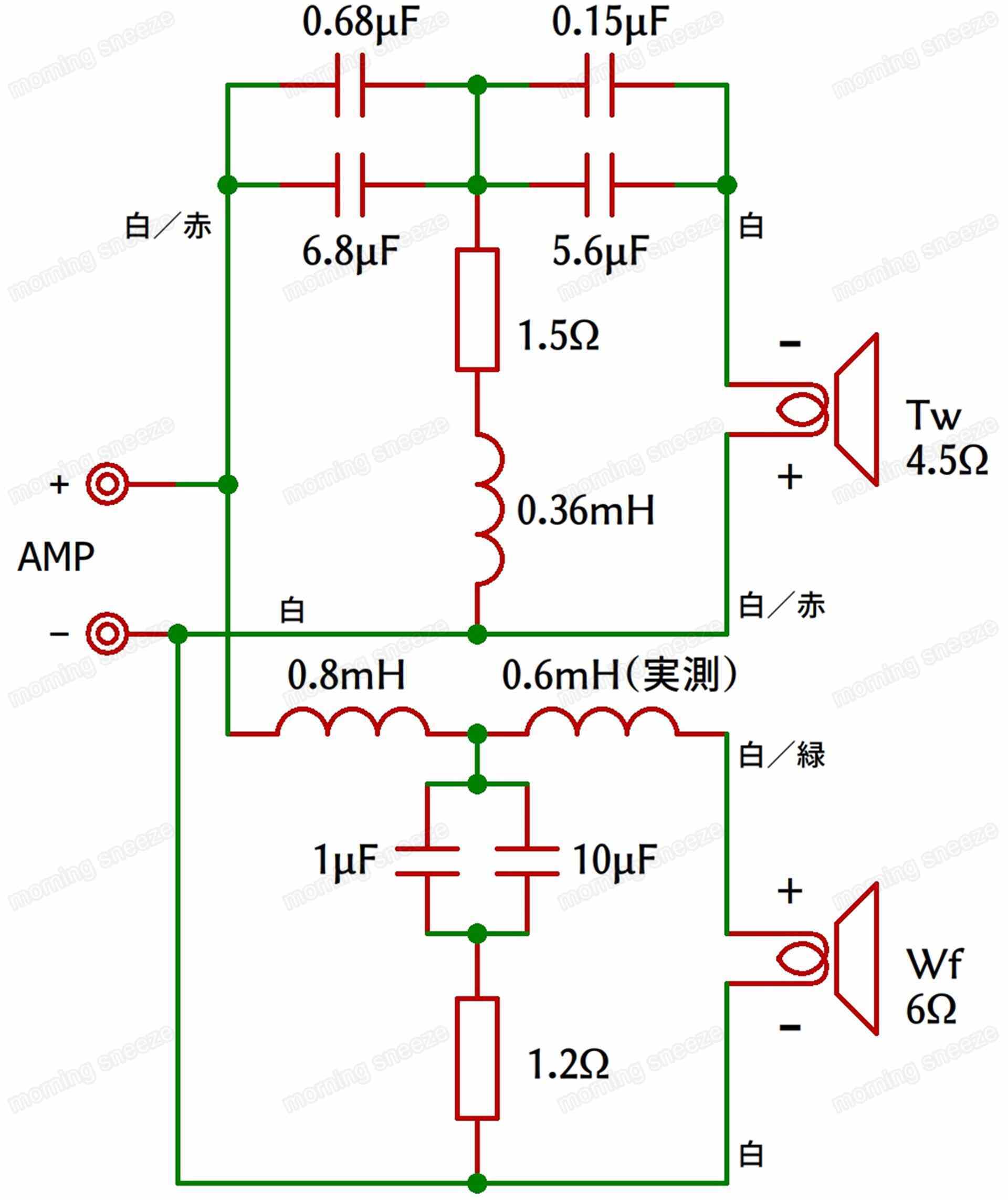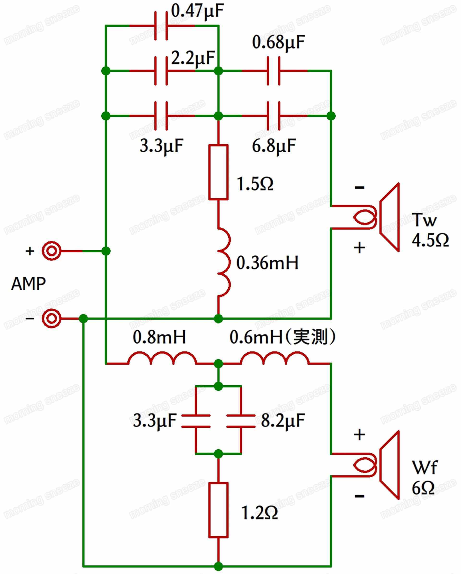フィルター回路は、いずれも18db/octを基本とする構成である。ツイーターは逆相接続。