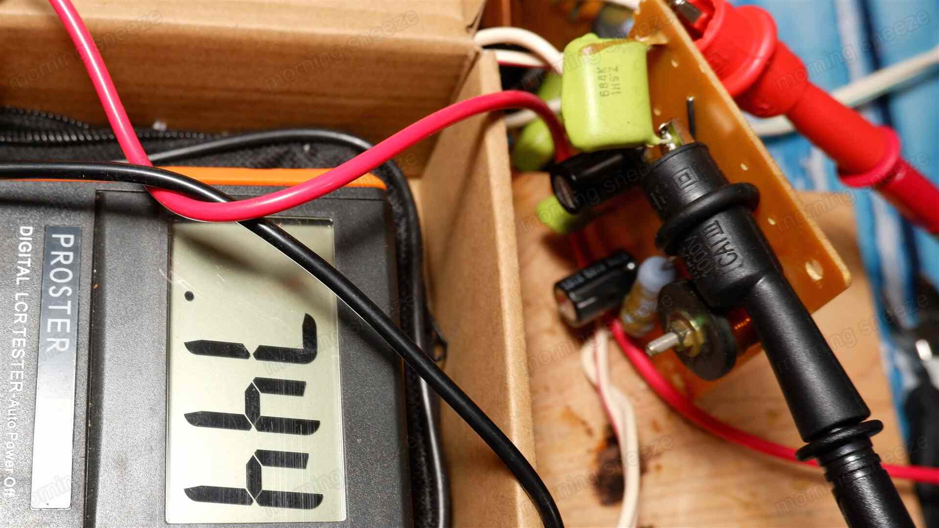 オリジナルの静電容量は5.75μF。ただ、新しいものは在庫の都合で3.3+2.2+0.47の三つを並列させることになる。合計で約6.0μFとなり少し大きくなるわけだけど、既存の実測値はこれよりさらに大きいくらいなので、改修前と比べて実質的にそこまで差がないし、まあいいかという感じ。