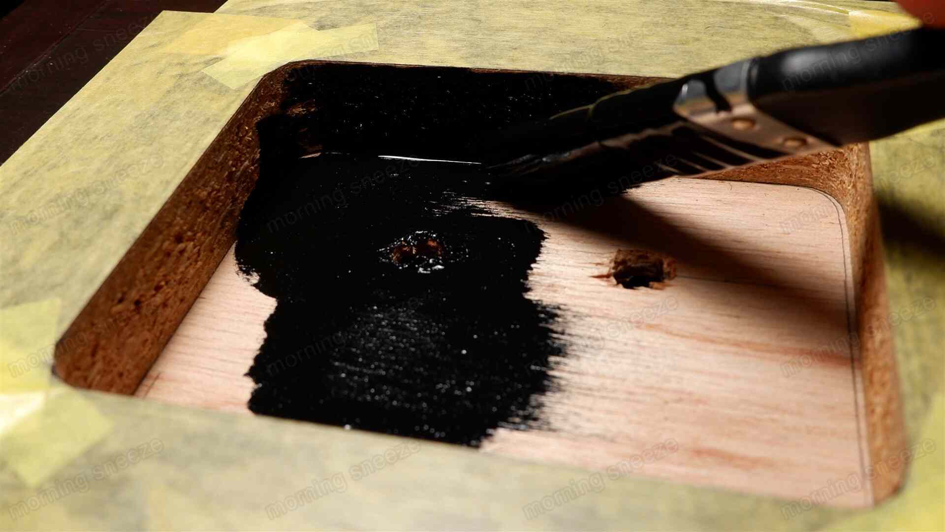 ここにバインディングポストと固定用のネジを通すための孔を開け、塗装を施す。筐体の開口部にマスキングテープを貼り、パーティクルボードの断面にも塗りこむ。