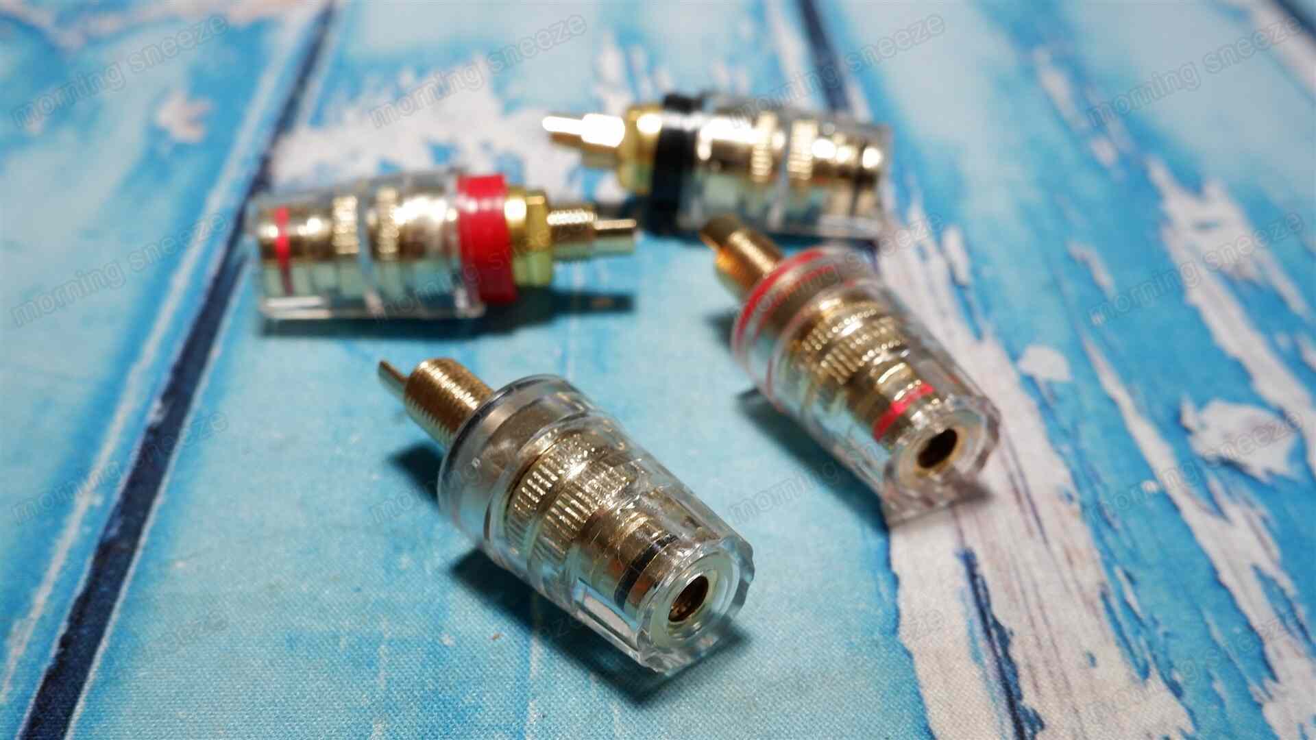 背面のコネクターユニットは大型であるものの、現代であればやはりバナナプラグ着脱の利便性は欲しいところ。というわけで新しいポストに交換する。