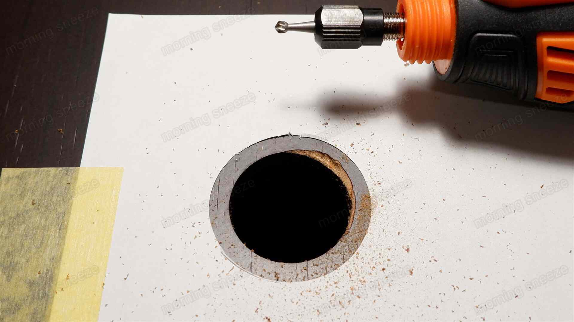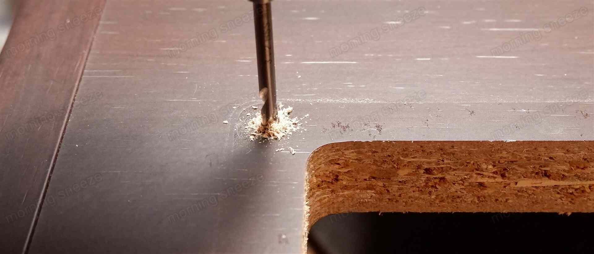 ベニヤ板の固定は、長さ25mmのM3ネジで行う。既存のネジ穴を拡張し、ネジを通せるようにする。