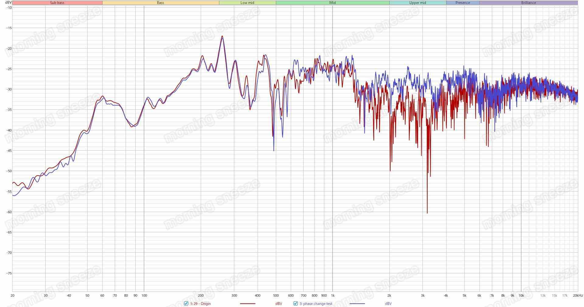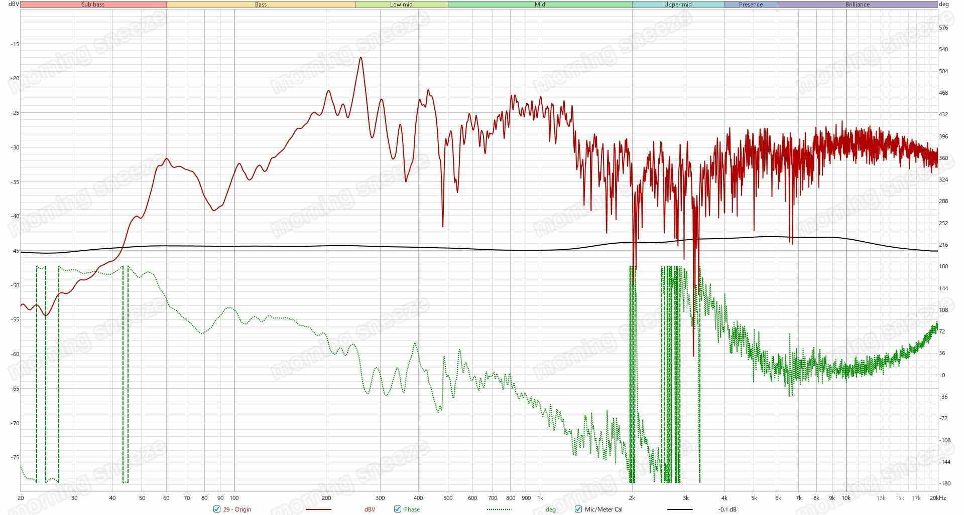 およそ聴感と同じといったところ。高めの中音一帯に見えている不安定な稜線は、経験上なんとなく、ツイーターとウーファーの位相が噛み合っていない状態のような印象を受ける。