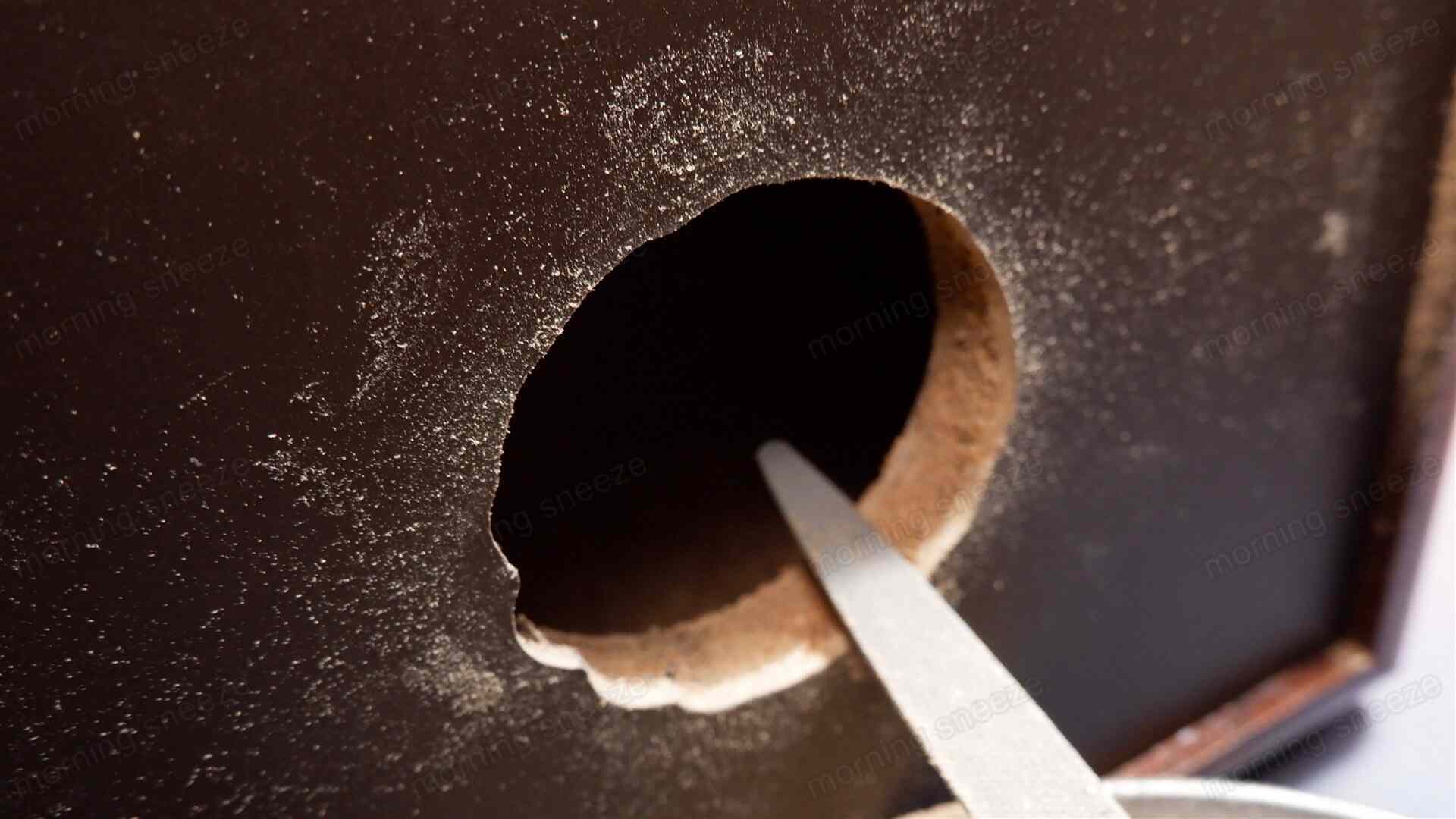 既存の開口部を少し拡張する。オリジナルの紙のダクトの開口部が付き合わさっていた厚み5mm弱のファイバーボードを数ミリ削り落とすだけなので、やや粗めのやすりを使って少し擦ってやれば簡単に広げられる。