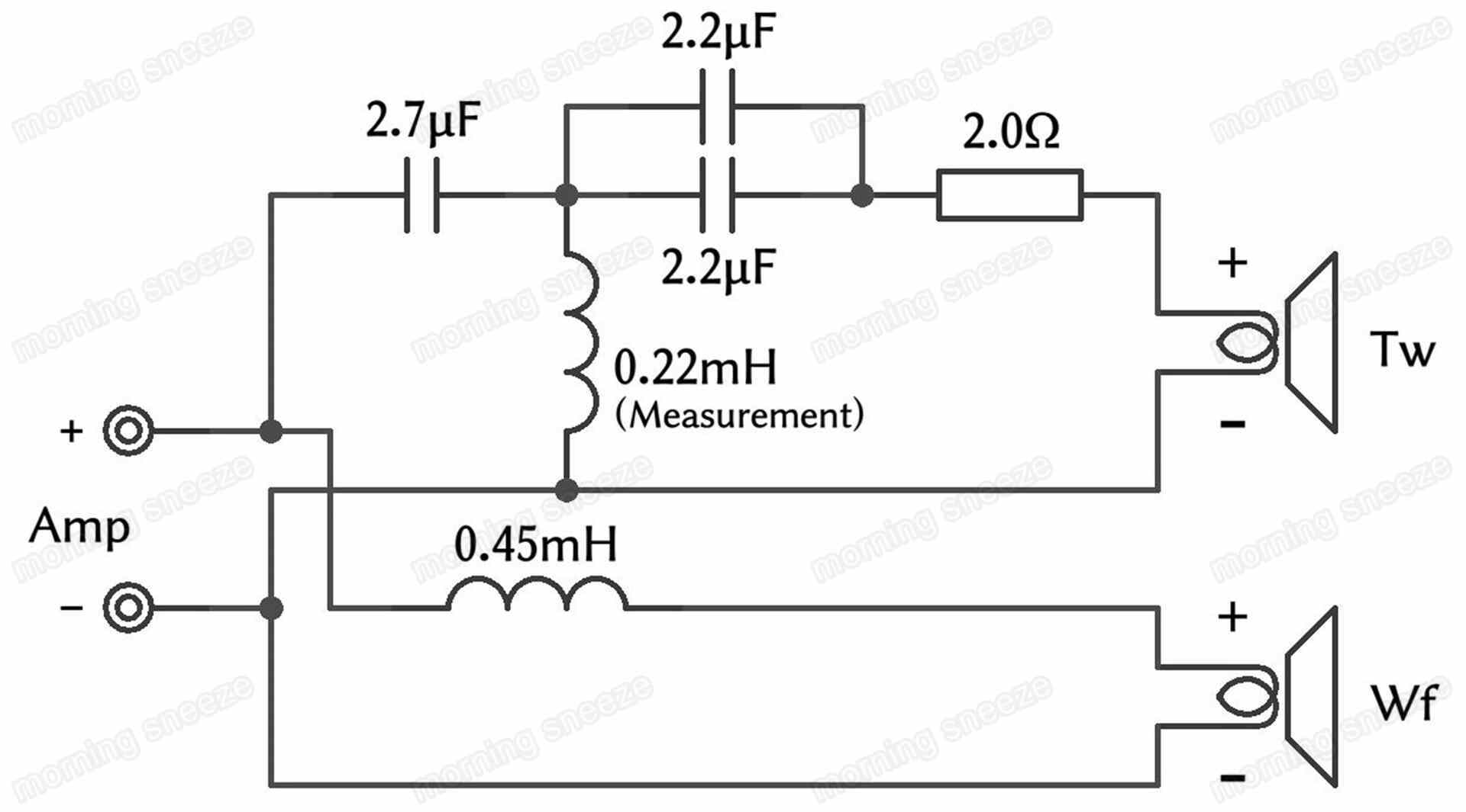 ネットワーク回路自体はシンプルだ。後輩のスピーカーに見られる共振回路を組むようなことはされていない。