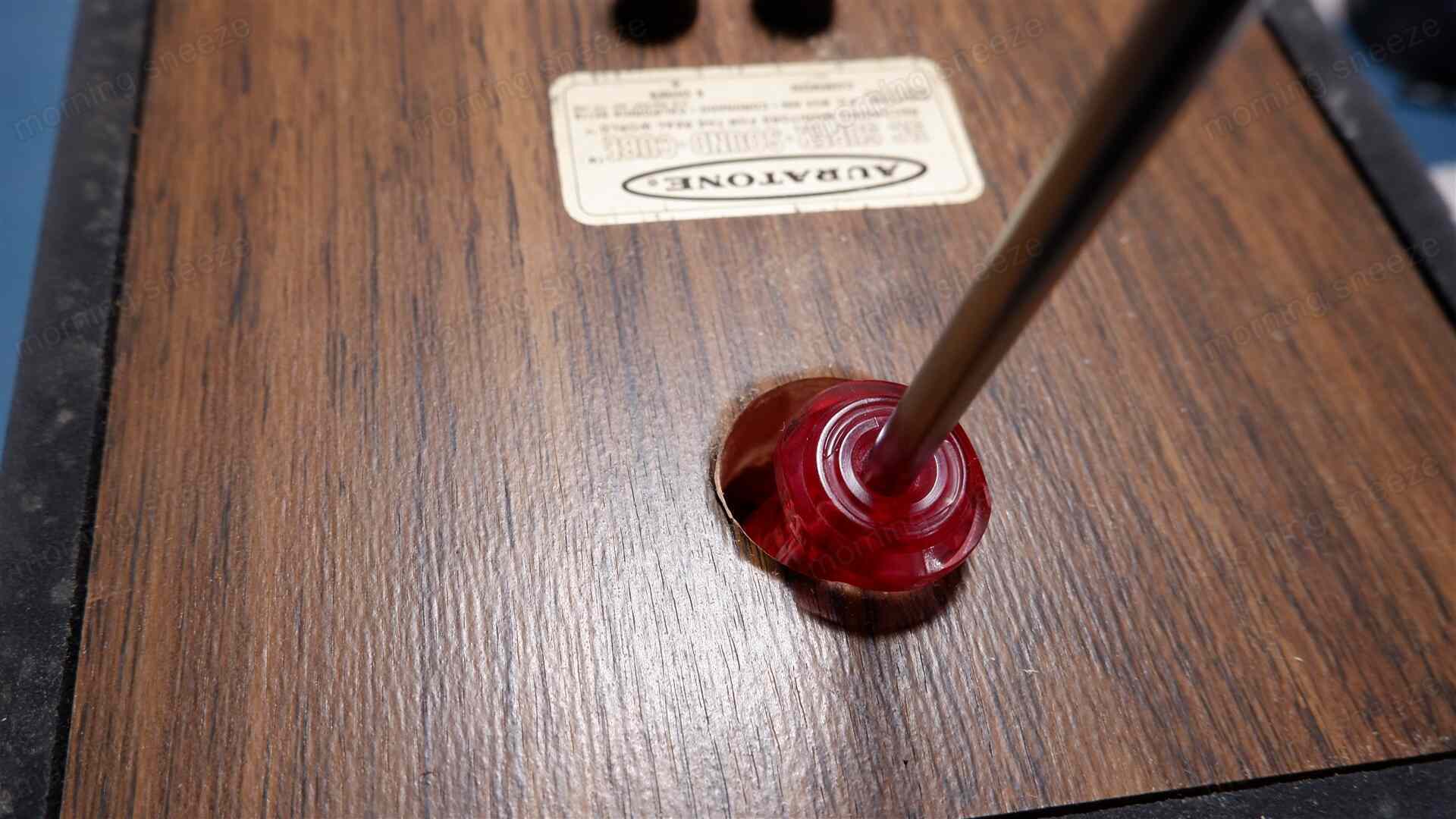 バスレフポートでもあれば利用できるのだけど、密閉型のこのスピーカーには無い。ここは背面にドリルを貫通させて、そこにドライバーの柄を挿し入れてマグネットにアクセスするかたちに。