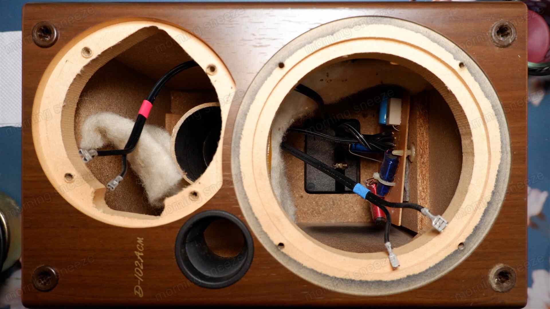 内部の吸音材は、天然のウールのようだ。極少量で、ウーファーのマグネット周りと、ツイーターの真後ろに少量天面から吊るされるようなかたちで固定されているのみ。