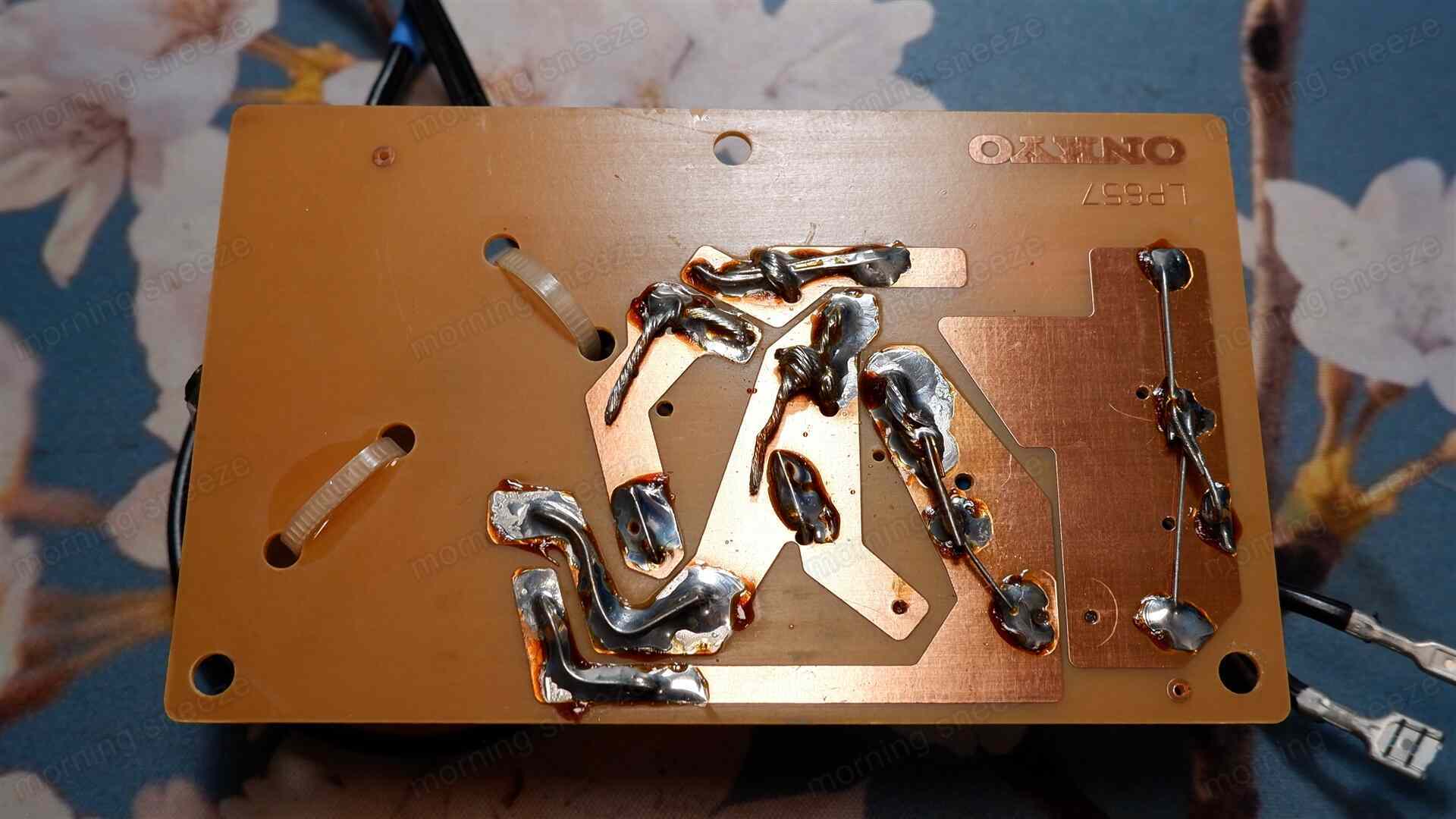 基板は、オンキヨーのスピーカーでよく見るナイロン製のスタッド3点で固定されている。しかし、そのうちの一か所はロックが外れ、基板が宙に浮いている状態となっている。