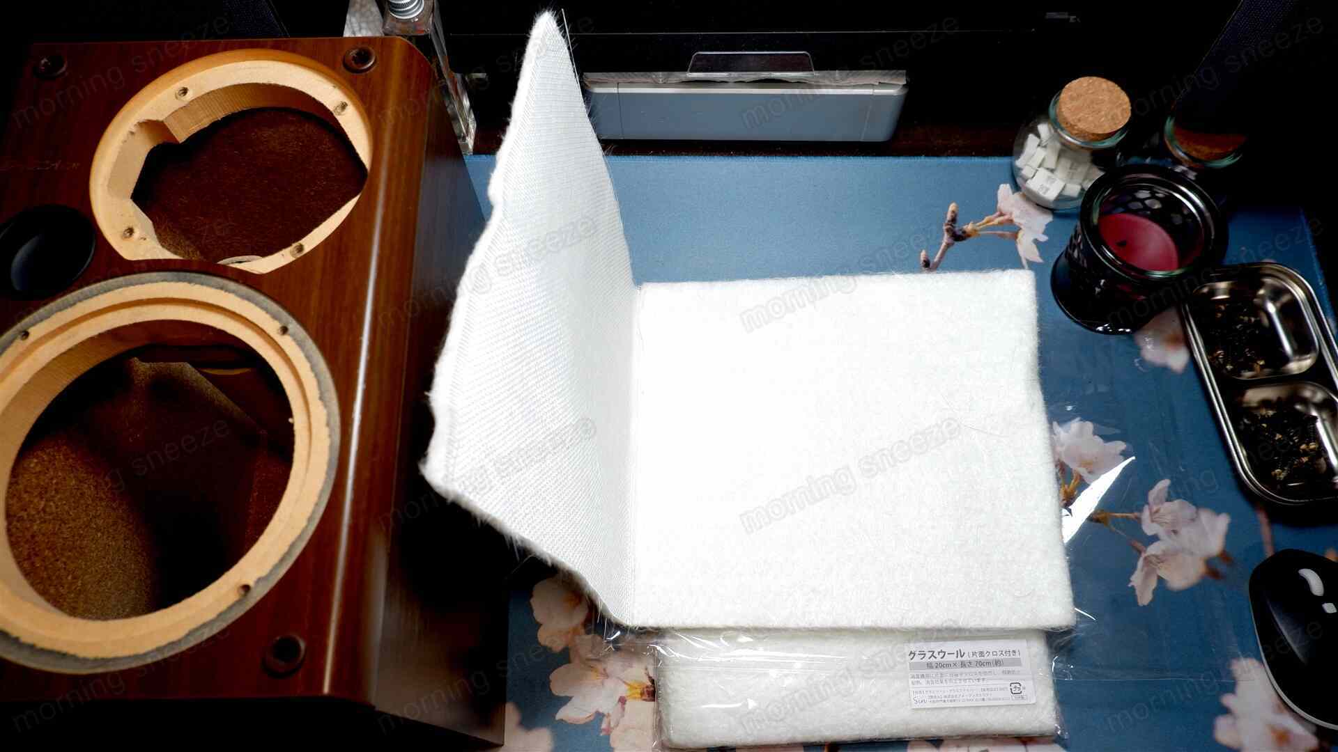 とりあえずこの段階で、吸音材の追加を済ませる。柔らかめのニードルフェルトを、グラスウールの上から押しこんでおく。