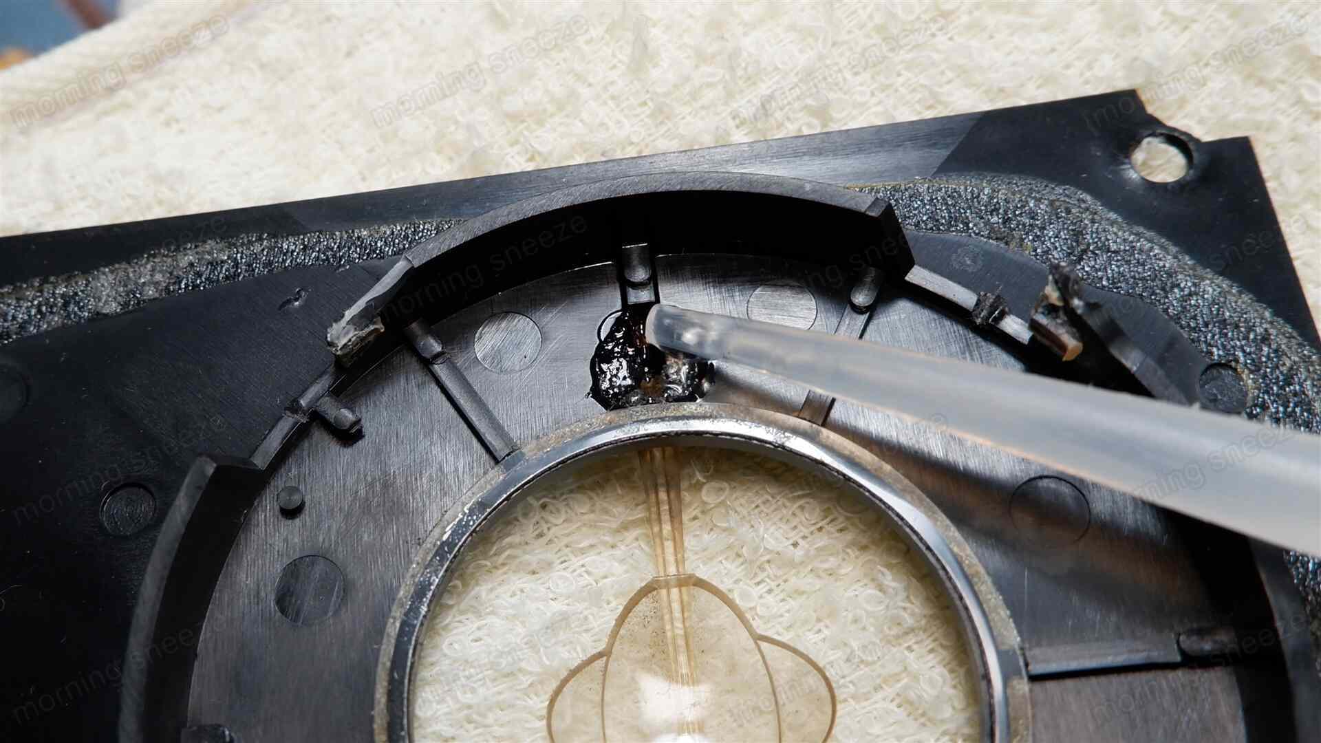 透明のイコライザーは、パネルに接着剤で固定されているだけなので、適当な溶剤を少量垂らしてグリグリしてやれば簡単に外れる。