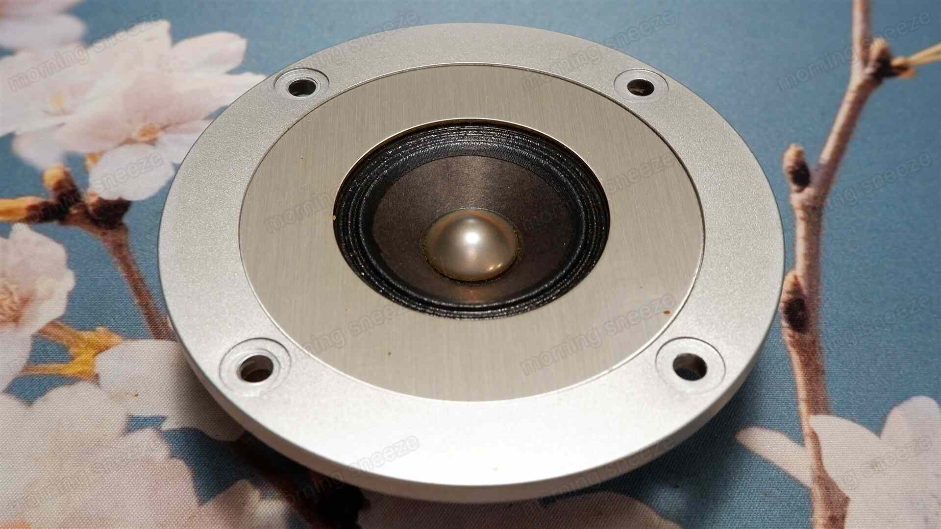 前面の振動板周辺はヘアライン仕上げのアルミプレートで、ここを剥がすとさらに分解できそう。例によって、今回はやらない。