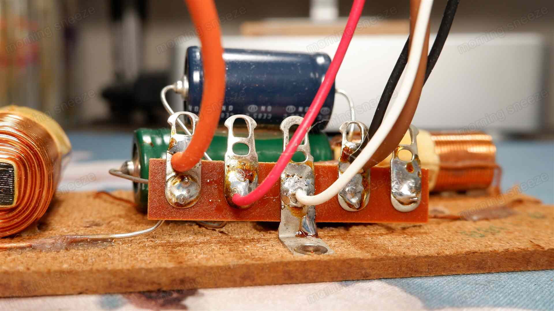 ただ、アキシャルのものは用意できなかったので、既存と同じ位置に設けることが難しい。幸い既存の繊維板上で空いているスペースにイイ感じに収まることがわかったので、ベースとなる繊維板を拡張することなく、ラジアルリードのParcAudio製電解コンデンサーを固定してしまう。