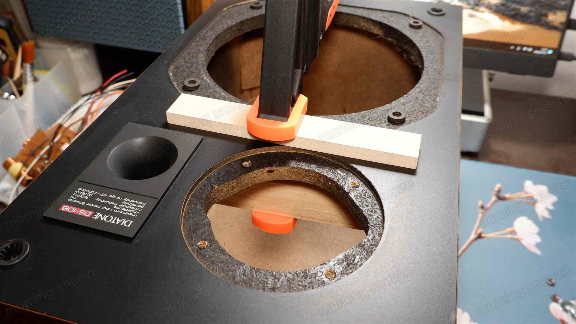 たまたま余っていた棒状の松材を適当な長さに切り落とし、ウーファーとツイーターのあいだの部分に固定する。