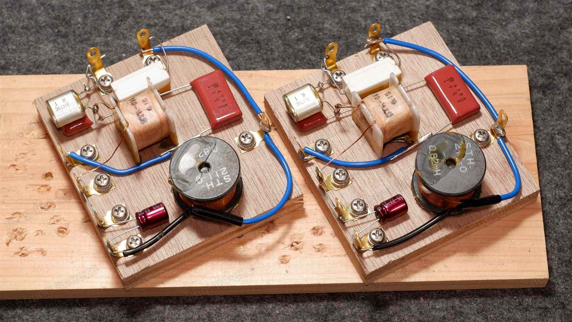 コンデンサーはHF回路をメタライズドポリエステルフィルムコンデンサーとする。ベースをスピーカー背面に括りつけるのは接着とするつもりなので、以降は原則内部を弄らなくて済むようにオールフィルムコンデンサーとするのも考えたけど、その前にエンクロージャーのほうが崩れそうだと考え、いつもどおりLF回路は電解コンデンサーとする。