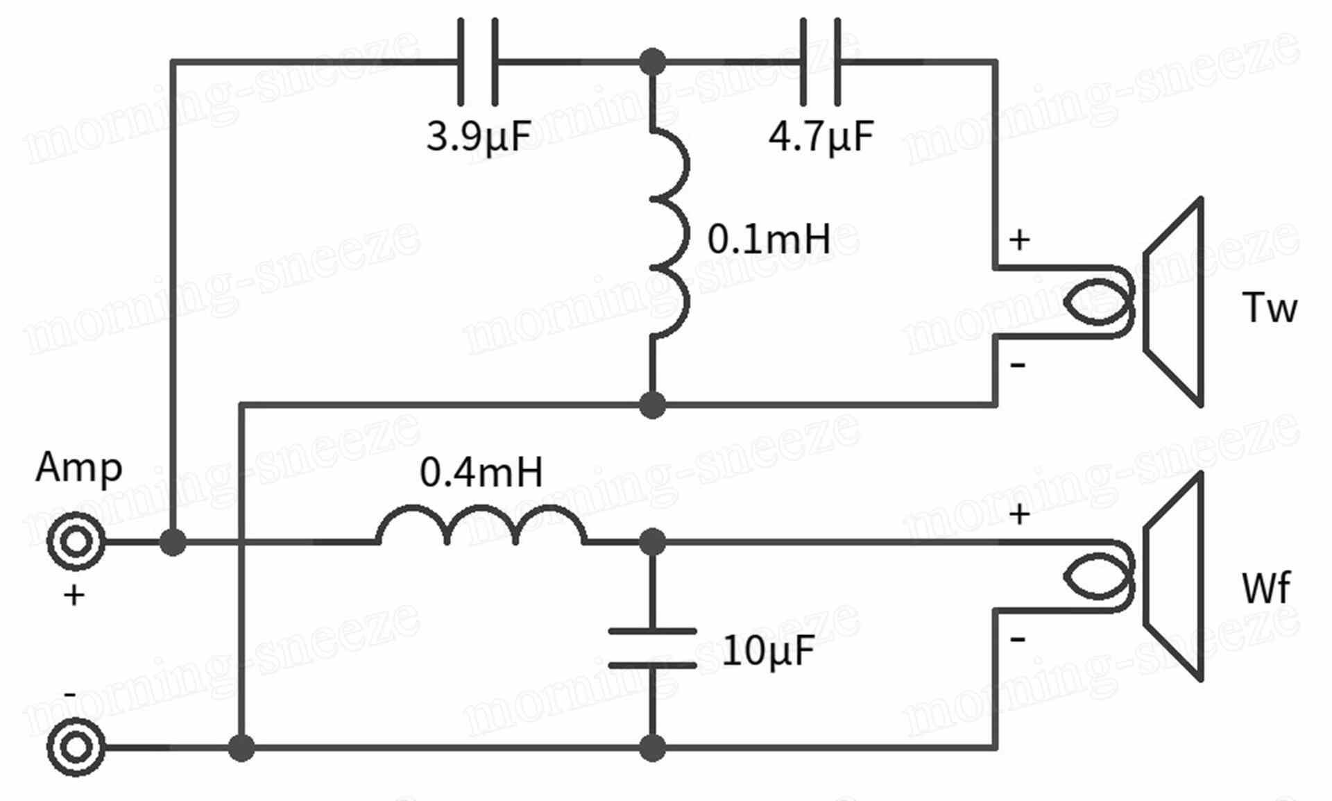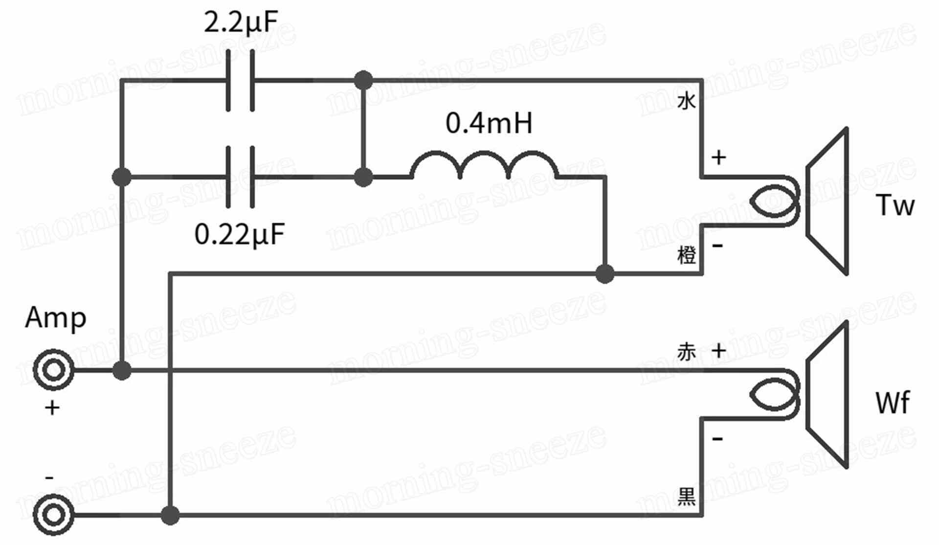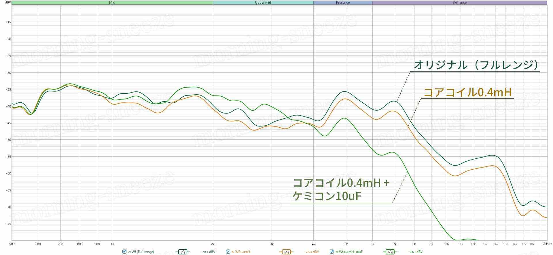 フィルタースルーだったミッドバス側は、HPFのコアコイル0.4mHをLPF1次用として流用。コンデンサーを付け加えて-12dB/octとする。