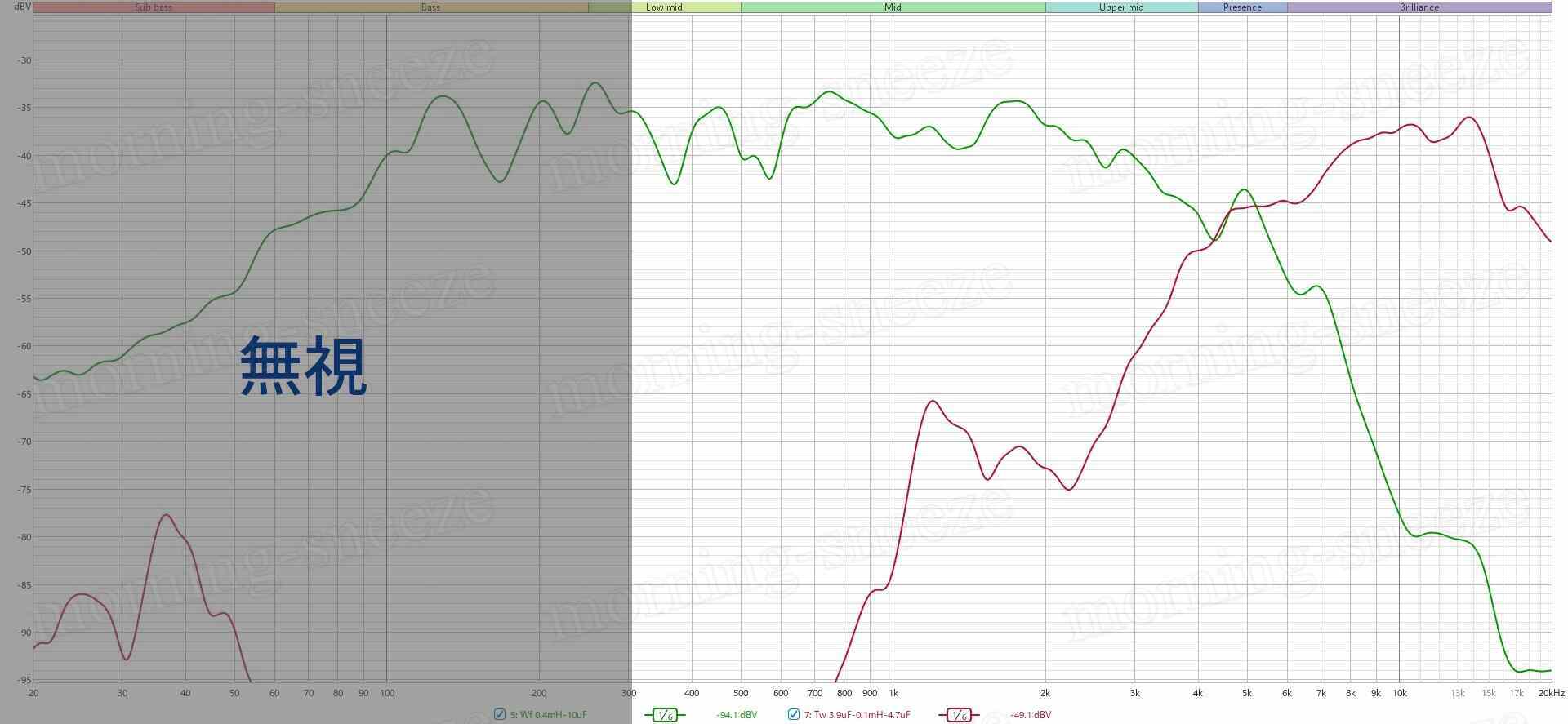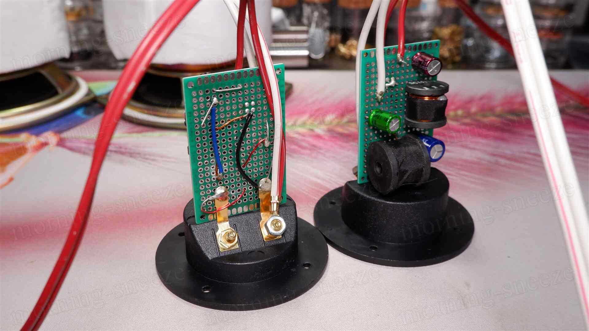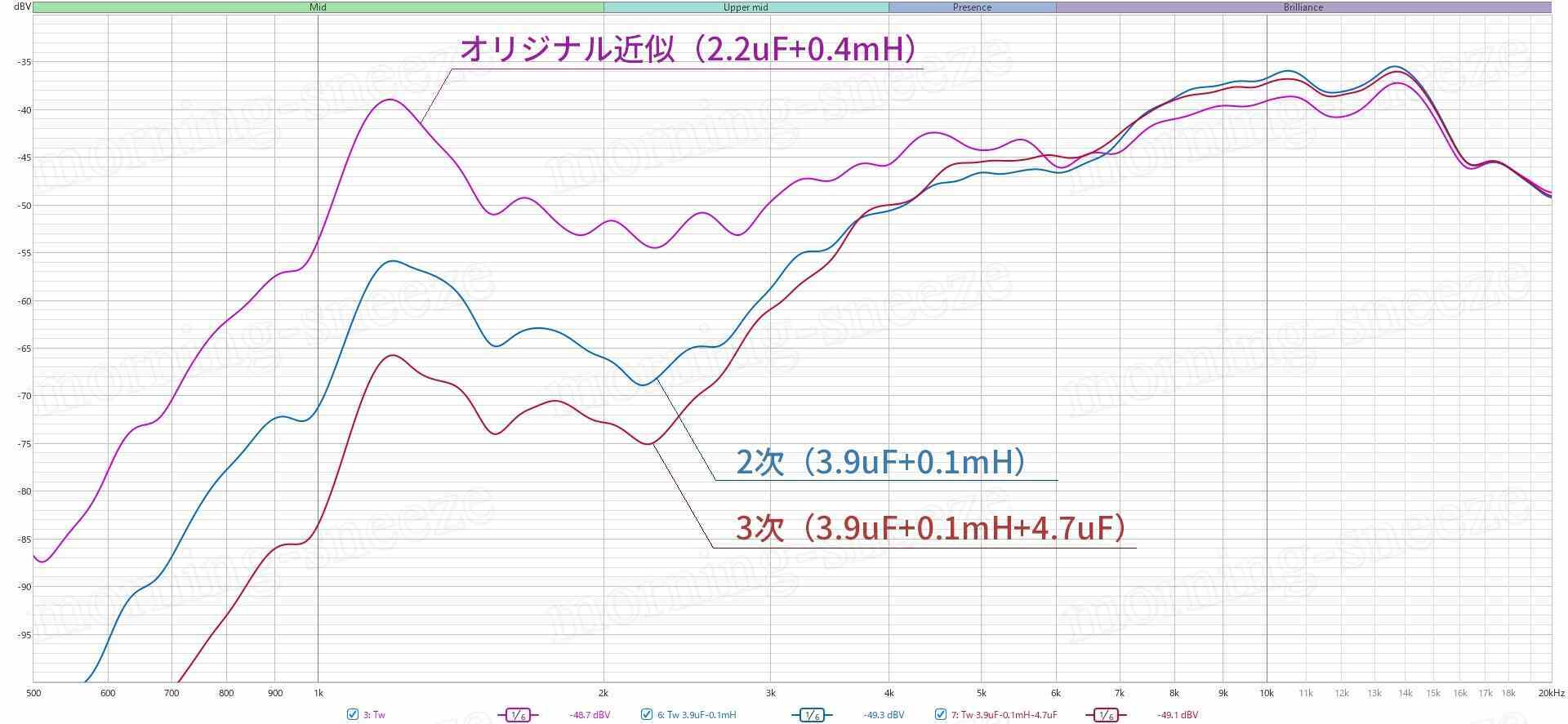 要調整となるのは、ツイーター自体が別物になっているHPF側。新ツイーターは、オリジナルほぼそのままのフィルターで鳴らすと、自身が持つ中音の強烈な共振を抑えることができない。まあ、これを見なかったことにするのもいいのだけど、せっかく新しく組むのだし、手持ちのパーツでなんとかなる範囲かつ違和感の出ない範疇で抑えつけてみる。