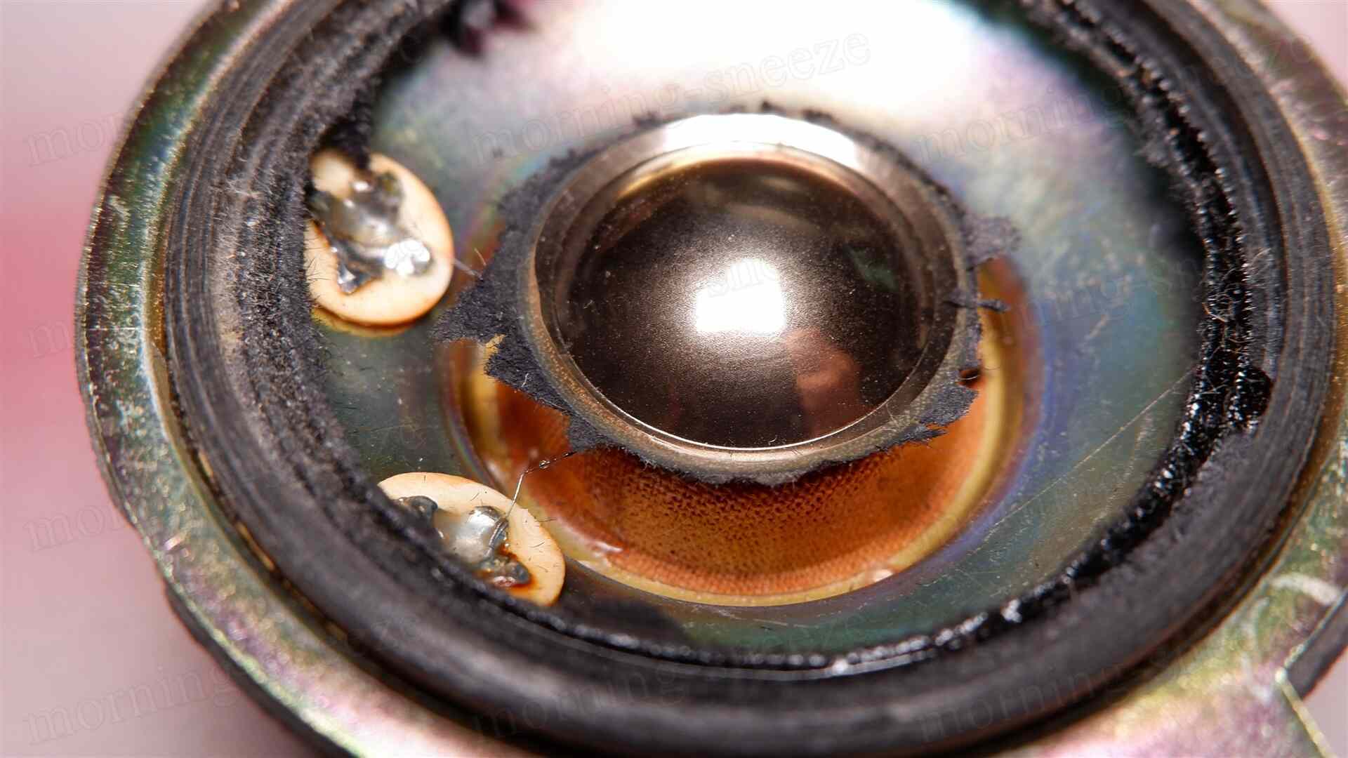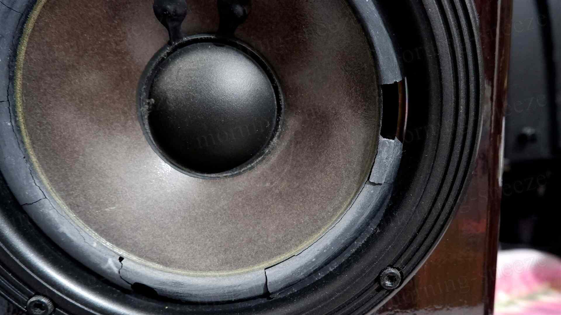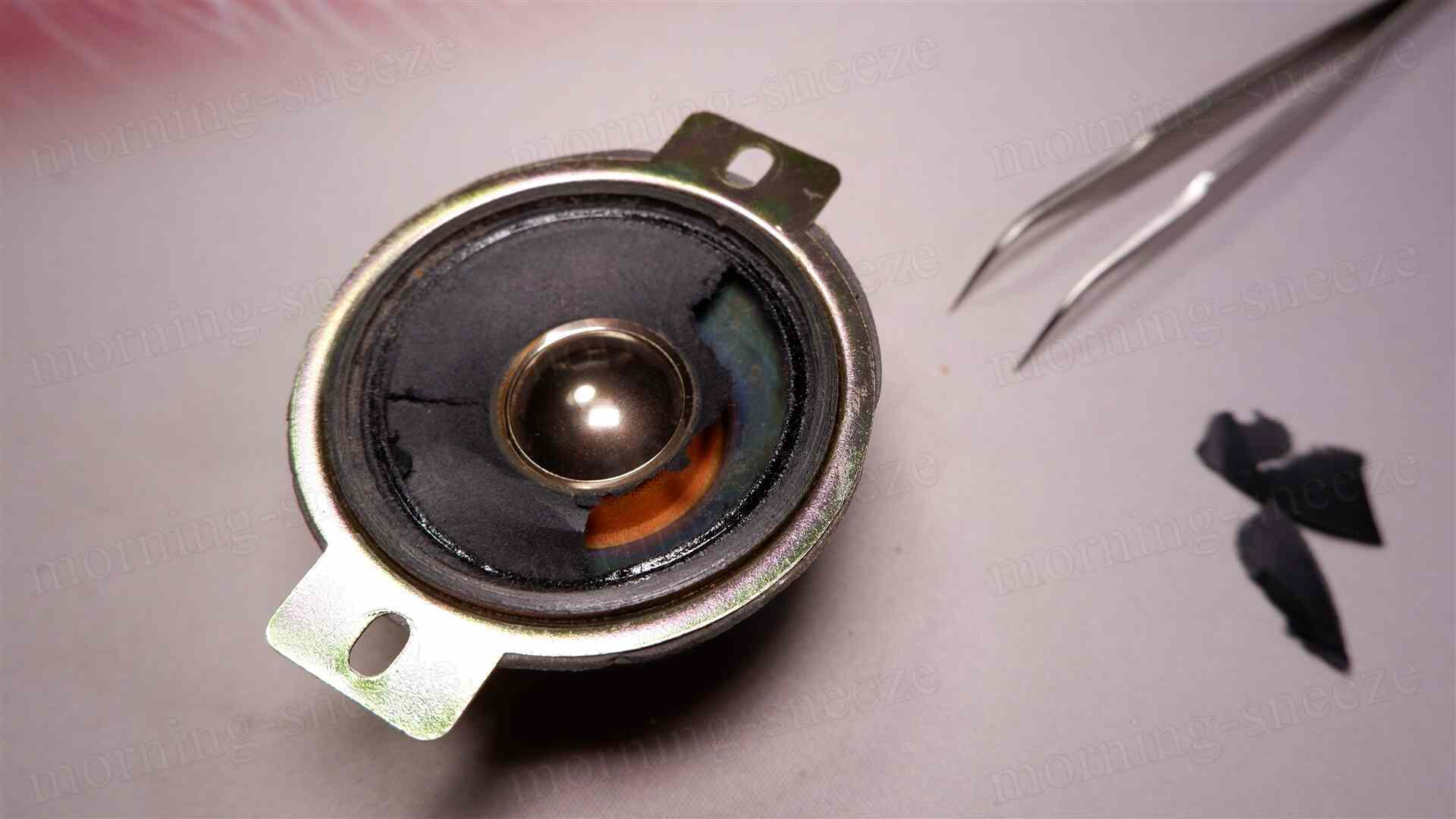 先に見たツイーターの振動板は、湿気でやられたのか脆くなっていて、破けたところから力無くボロボロと解れていく。