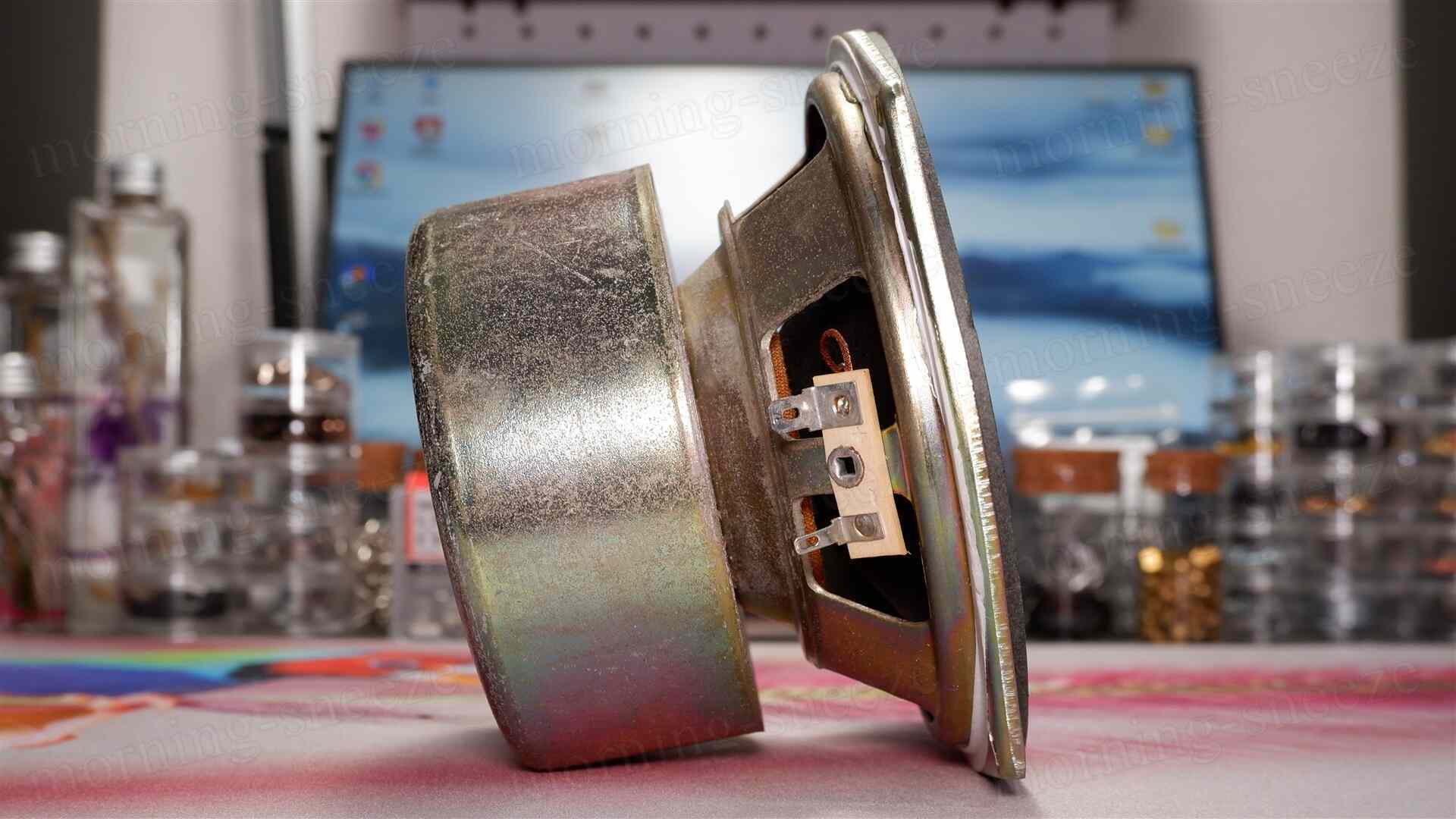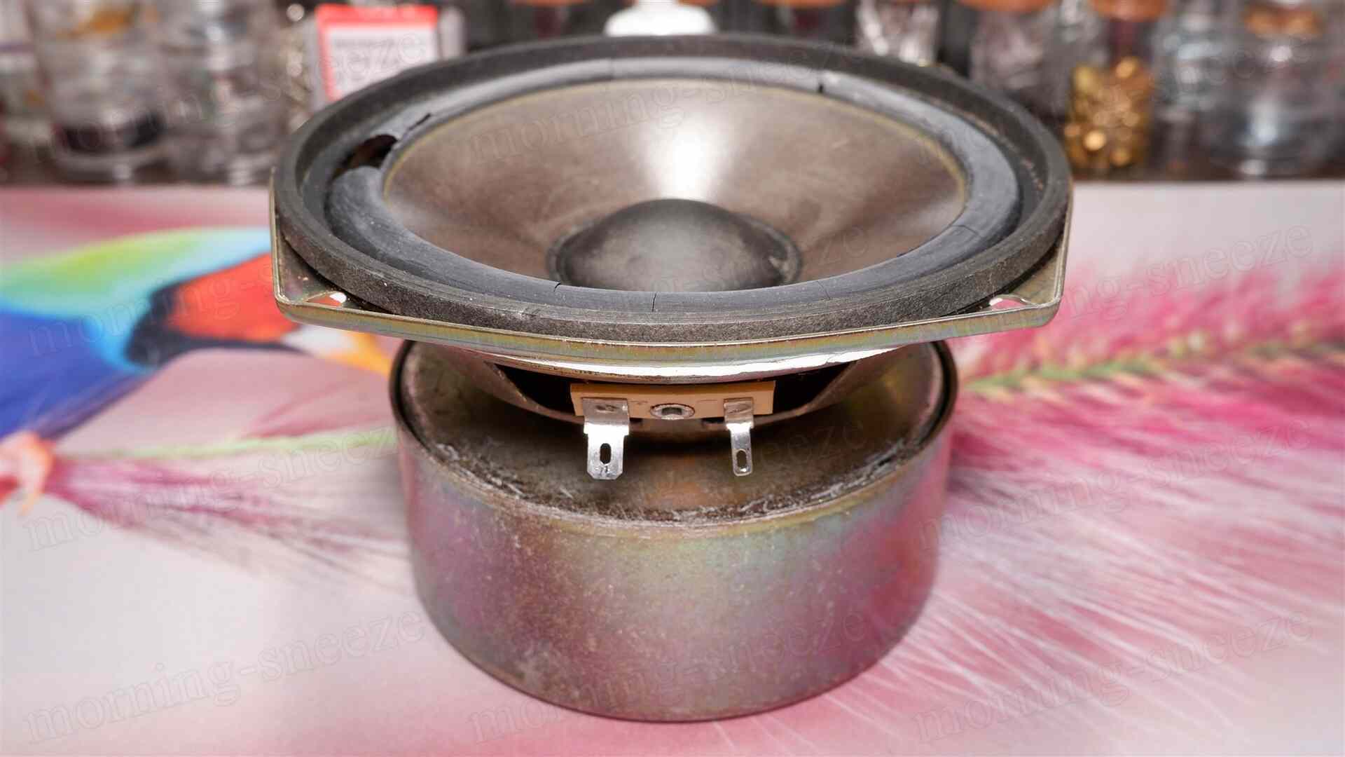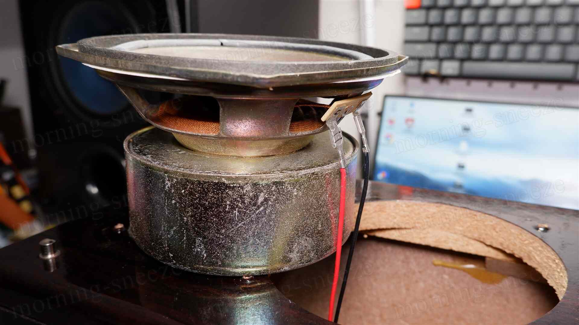 ミッドバスのサラウンドが朽ちているけど、音は出るらしい。表層に防湿加工のようなものが施されたパルプコーンに見える。