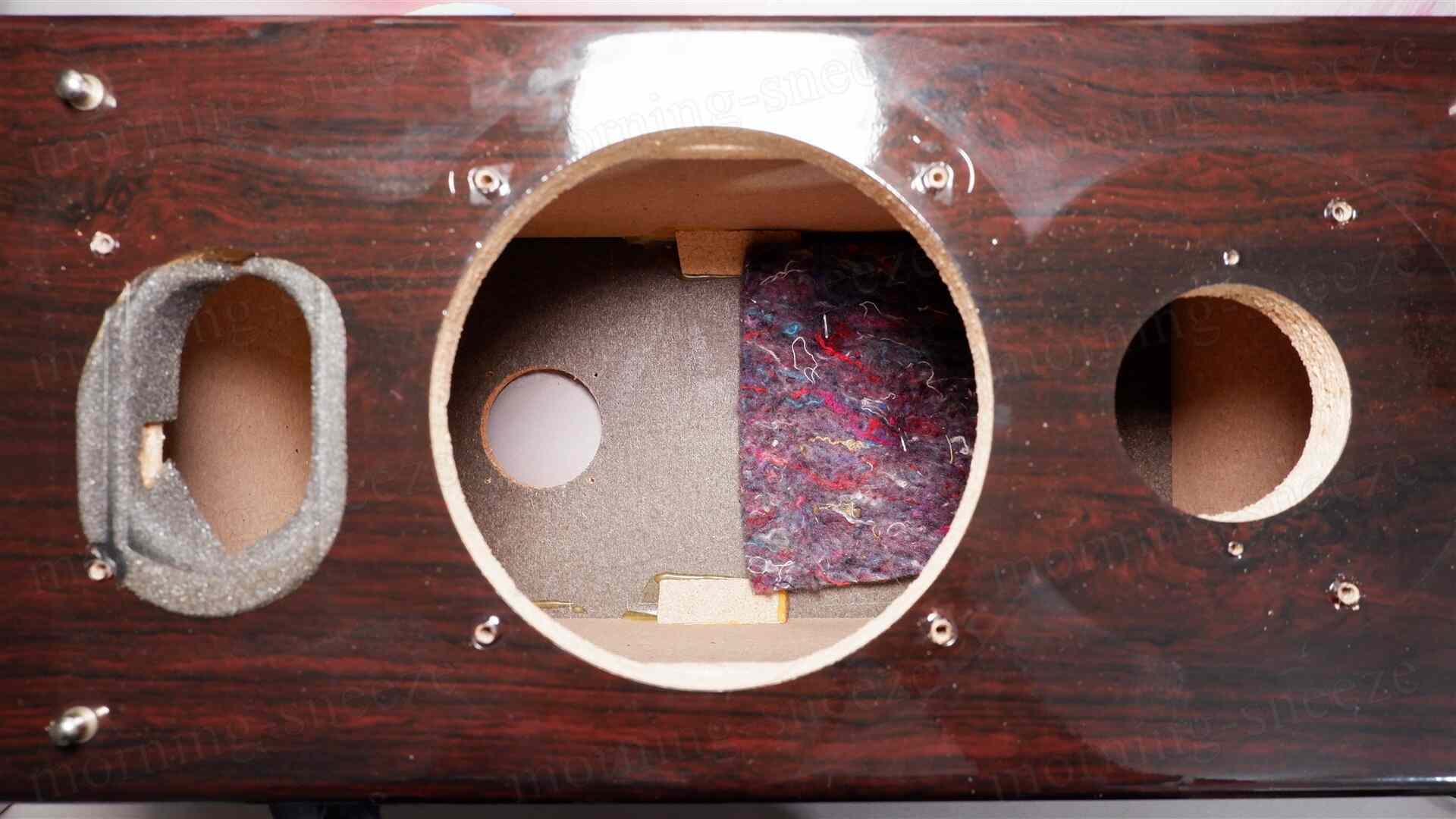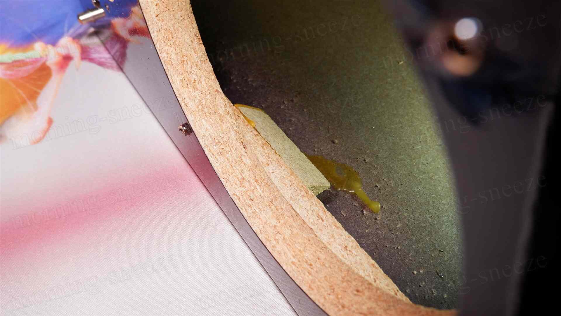 キャビネット側に内部の補強は無いけれど、前面バッフルとの接合部には細長い棒状の繊維材を流しており、脆弱部の補填をしている。