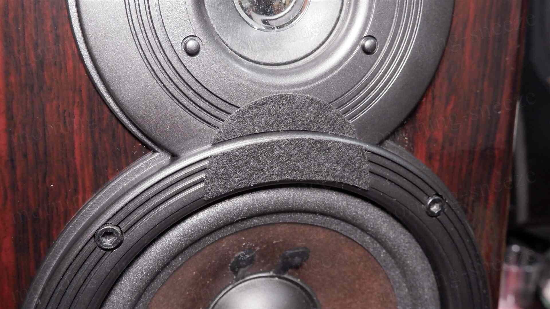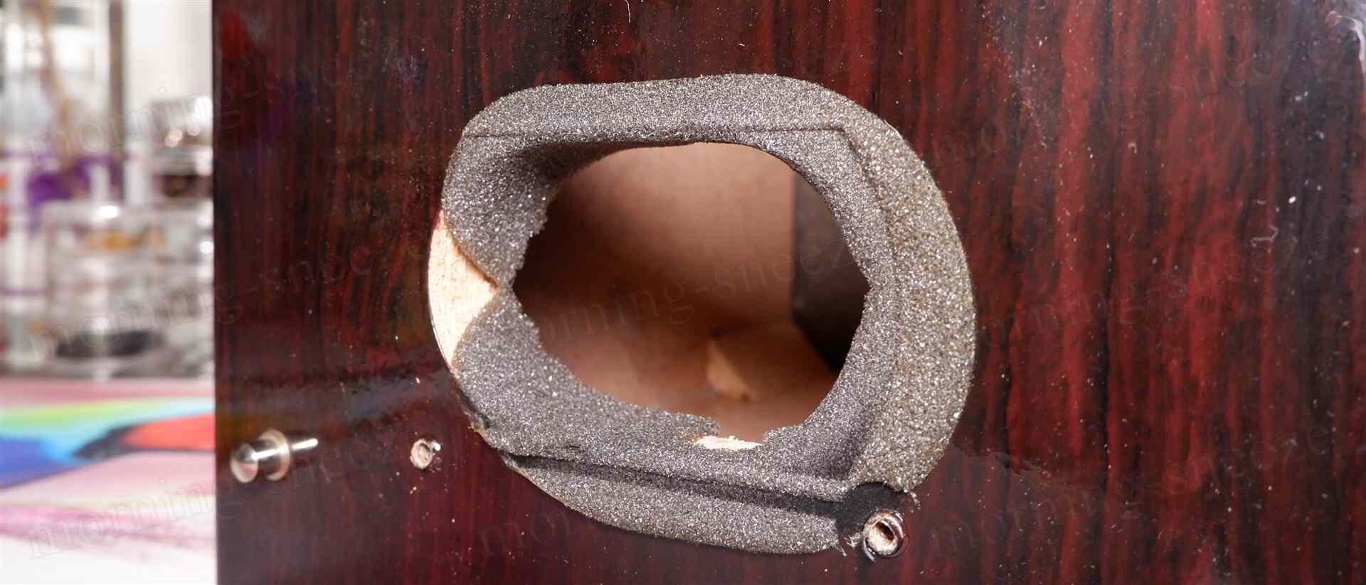 このツイーターユニットはオリジナルと同じネジ2点留めで、孔の位置も同じ。しかし単純に交換するだけとはいかない。バッフルに開けられた既存の穴は直径52mm強なのに対し、新しいユニットは51mmと微妙に小さく、そのまま固定するとバッフルとドライバー外周部とのあいだにわずかに隙間ができるためだ。