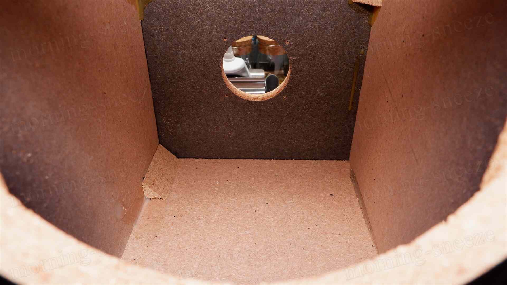 おそらくすべての面が単層パーティクルボードだろう。バッフルとキャビネット部で繊維質の大きさが異なり、バッフル板は比較してやや粗めとなっている。