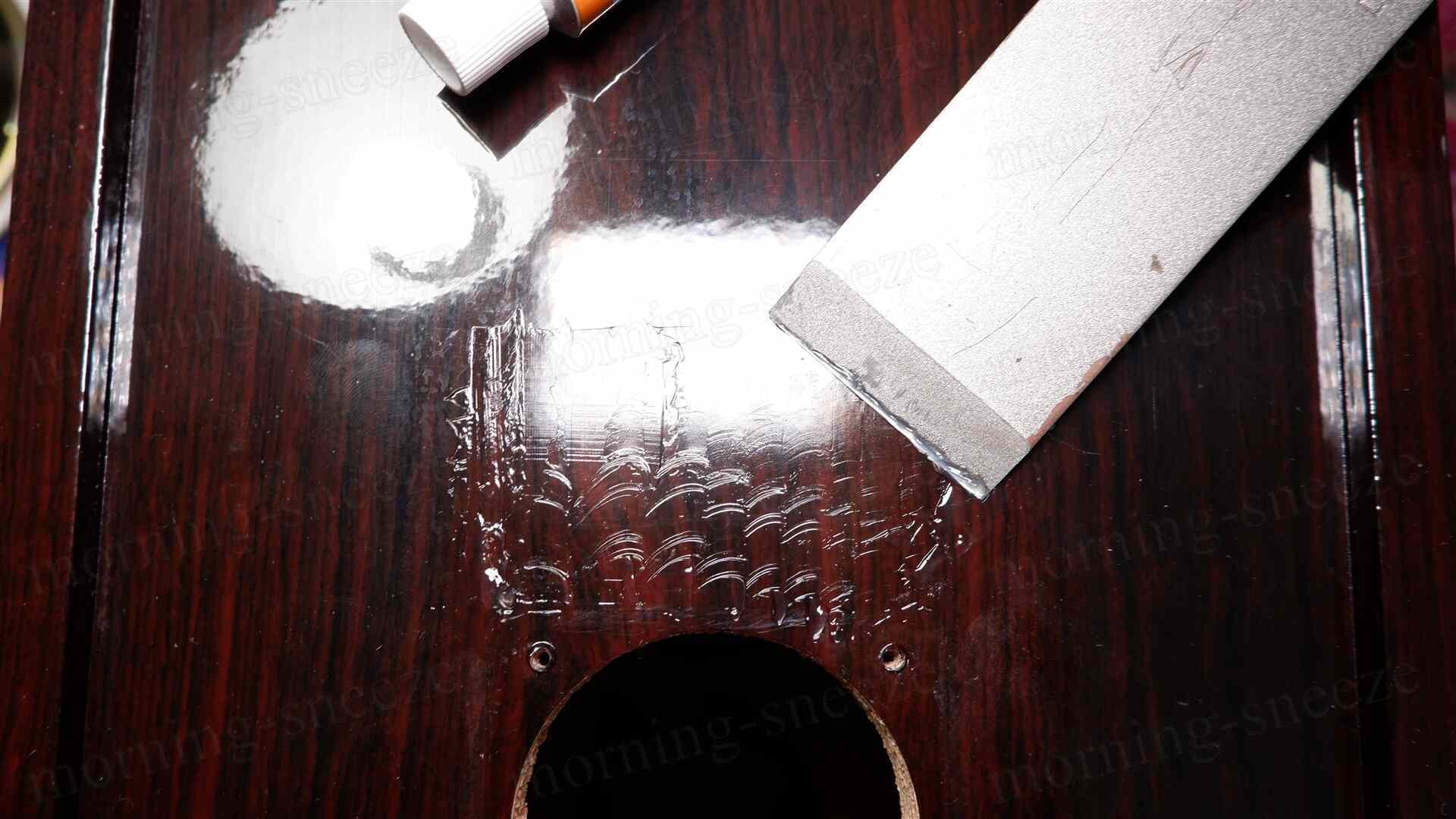 古いサラウンドや接着剤を撤去する。一応、ドライバーの外周に付いている既存の紙製ガスケットは再利用するので、なるべく綺麗に取り除く。