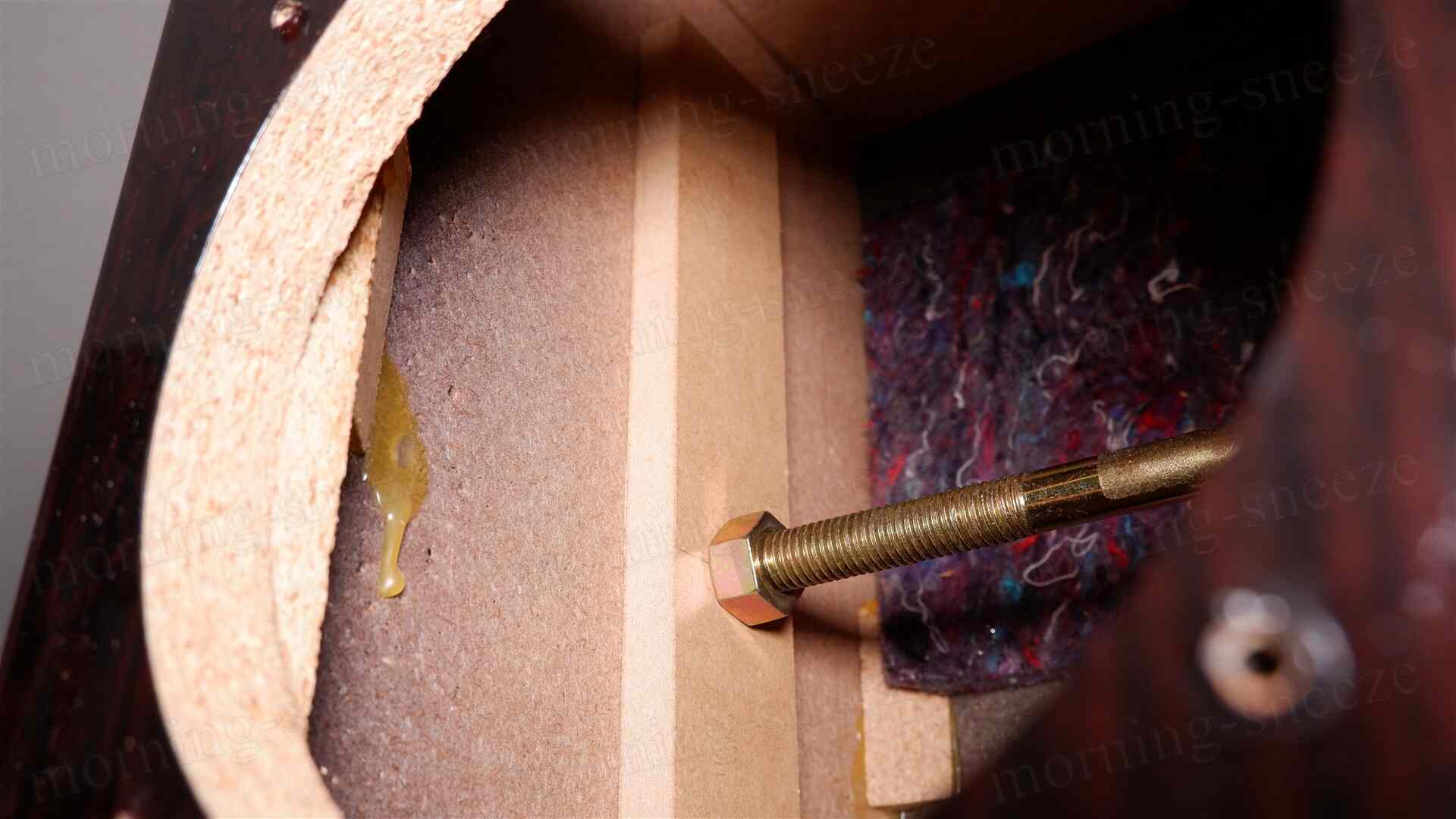 ナットを回しすぎて強く突っ張らせた状態にすると、その時はなんともなくても、時間が経つとエンクロージャーそのものが変形したりする可能性がある。テンションはボルトが落っこちない程度に留めて、ボルトの両端を接着してしまうのが吉。