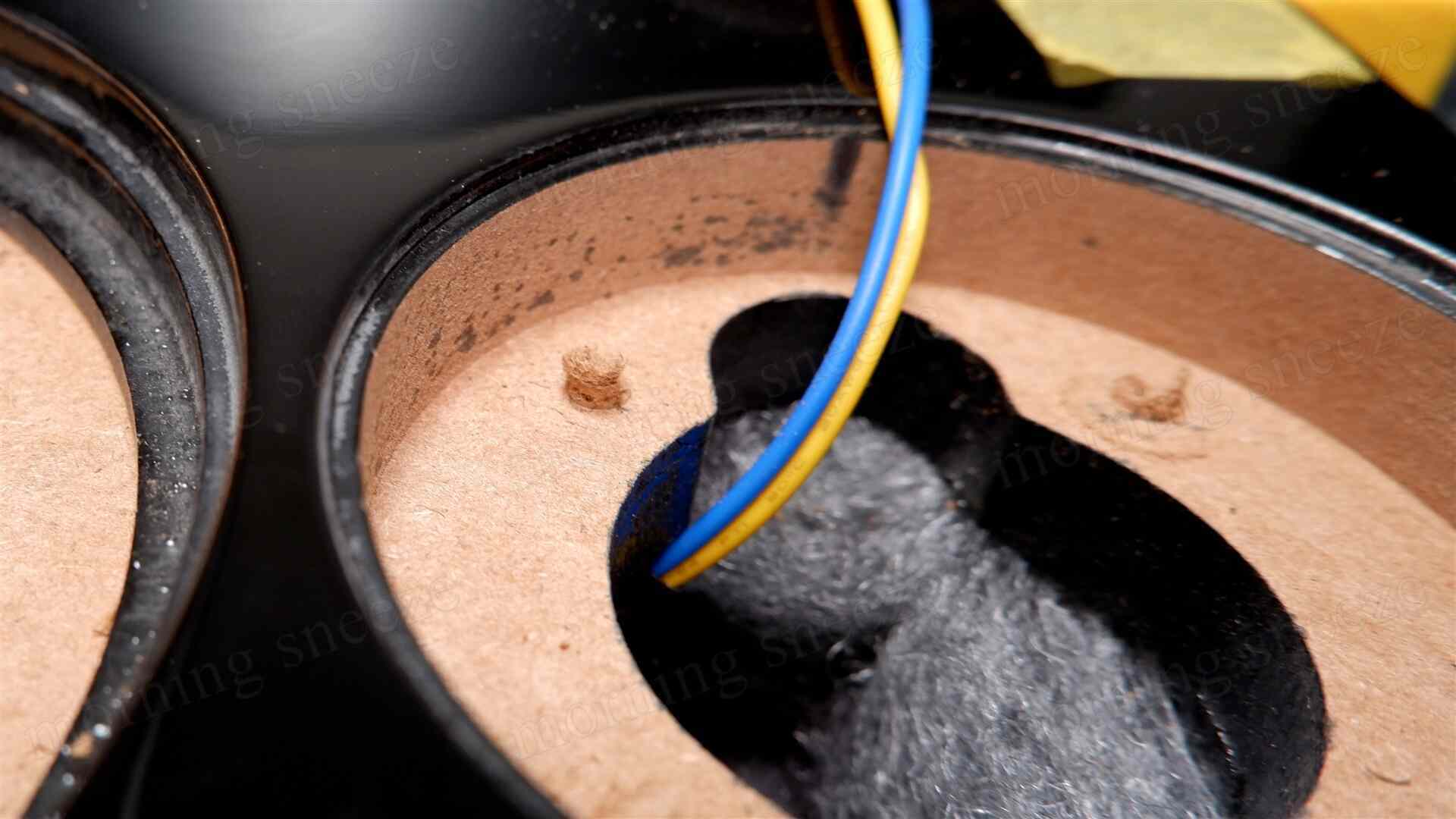 吸音材はすべて化繊ウールで、天面と両サイドにまたがる大きいシートが一枚、ウーファーのマグネットの真後ろに丸まるようにして詰められた小さいシートが一枚となっている。